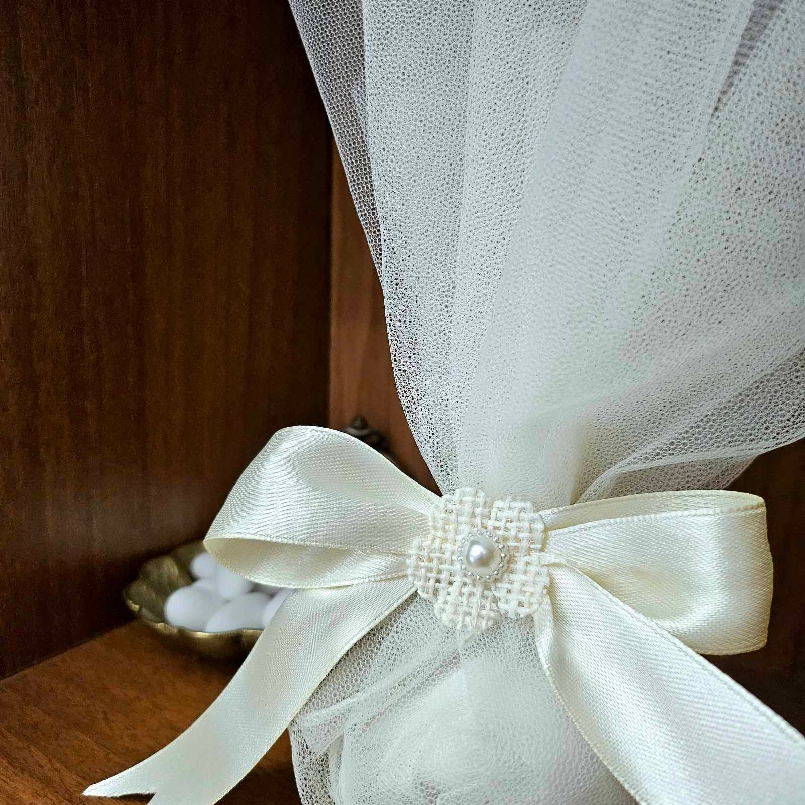 Διαχρονική μπομπονιέρα γάμου με πλούσιο λευκό τούλι, δεμένη με σατέν κορδέλα και διακοσμημένη με λουλουδάκι στο κέντρο. Γεμισμένη με εκλεκτά κουφέτα αμυγδάλου, αποτελεί μια κομψή και ρομαντική επιλογή που ταιριάζει σε κάθε elegant γάμο.