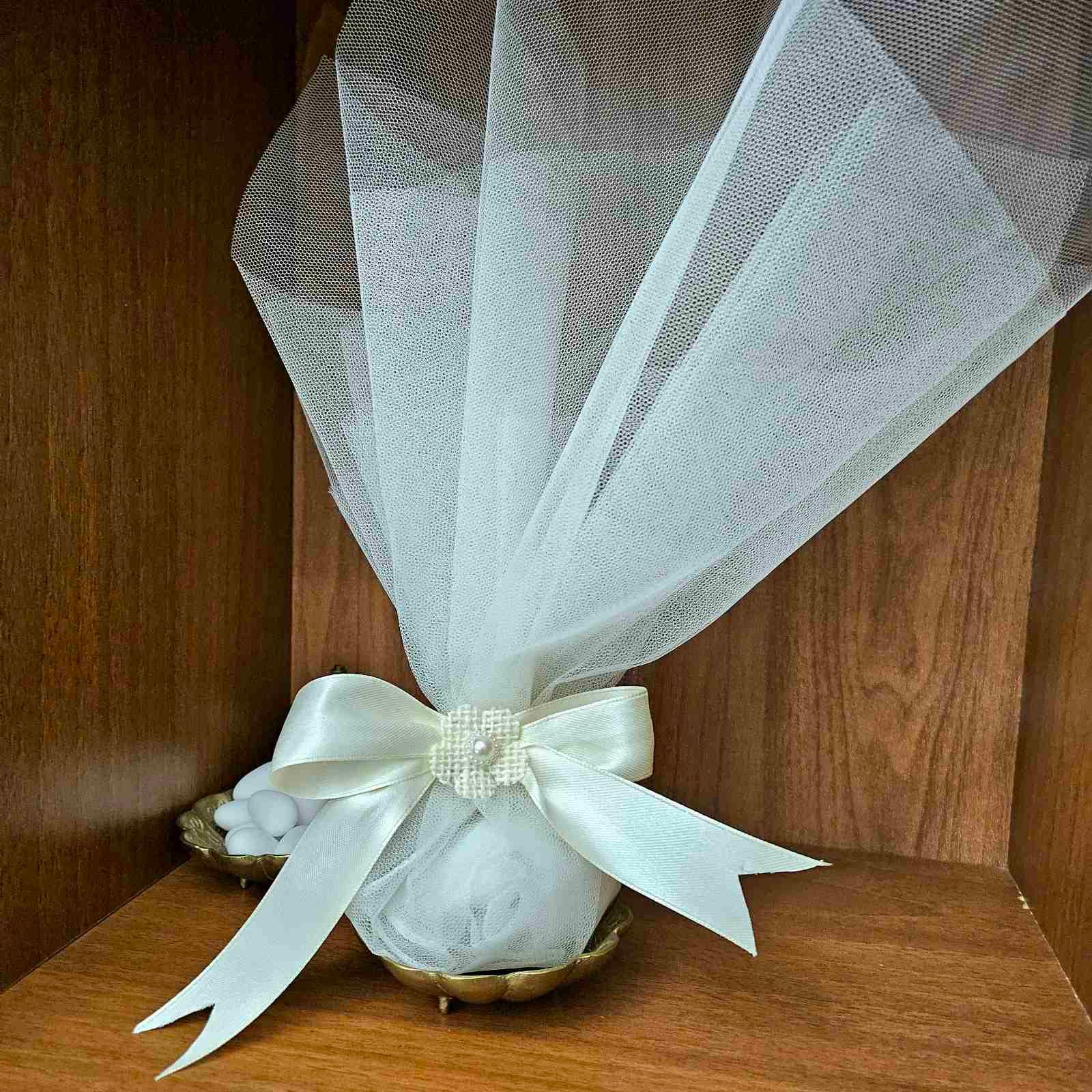 Μπομπονιέρα Γάμου με Λευκό Τούλι, Σατέν Κορδέλα & Λουλουδάκι