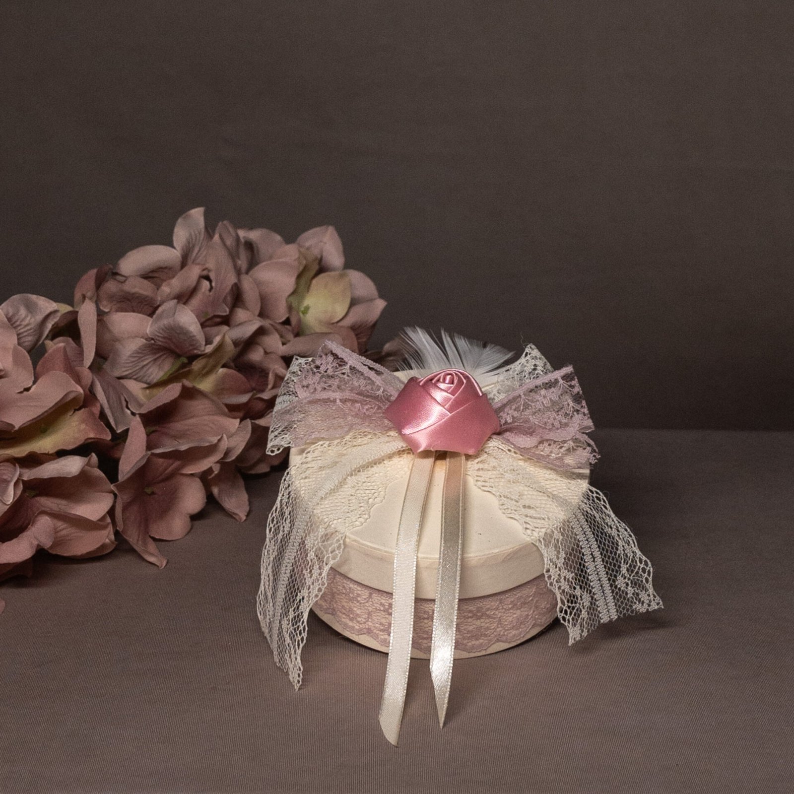 Χειροποίητη μπομπονιέρα γάμου σε στρογγυλό κουτί ντυμένο με δαντέλα, διακοσμημένη με σατέν κορδέλες και τριαντάφυλλο σε ροζ απόχρωση. Μια δημιουργία που αποπνέει ρομαντισμό και πολυτέλεια. ιδανική για vintage ή ρομαντικούς γάμους.