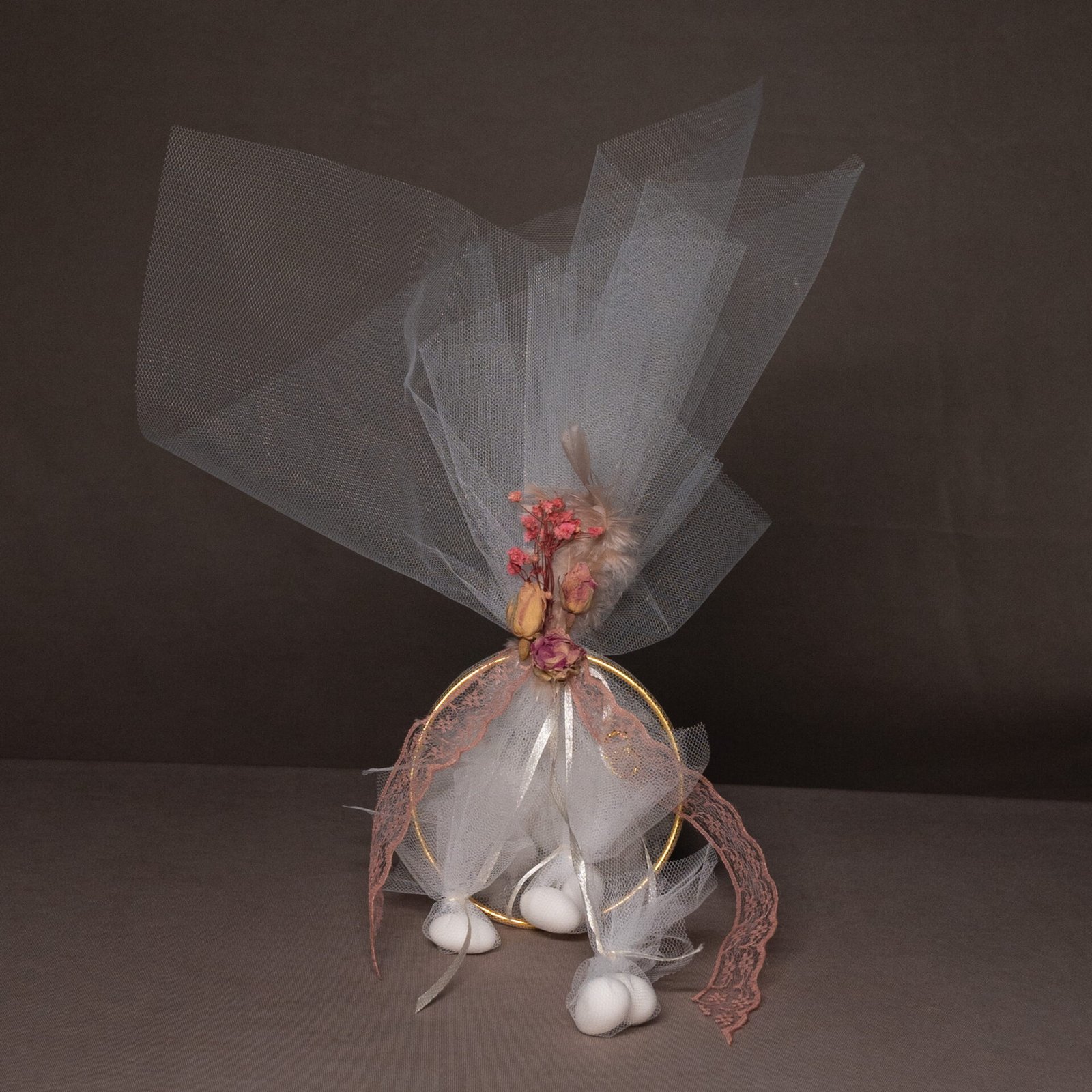 Χειροποίητη μπομπονιέρα γάμου με χρυσό κρίκο, πλούσιο λευκό τούλι και ρομαντικά αποξηραμένα άνθη. Συμπληρώνεται με δαντελένιες κορδέλες σε dusty pink αποχρώσεις και διακριτικό φτερό, δημιουργώντας μια elegant και ξεχωριστή σύνθεση.