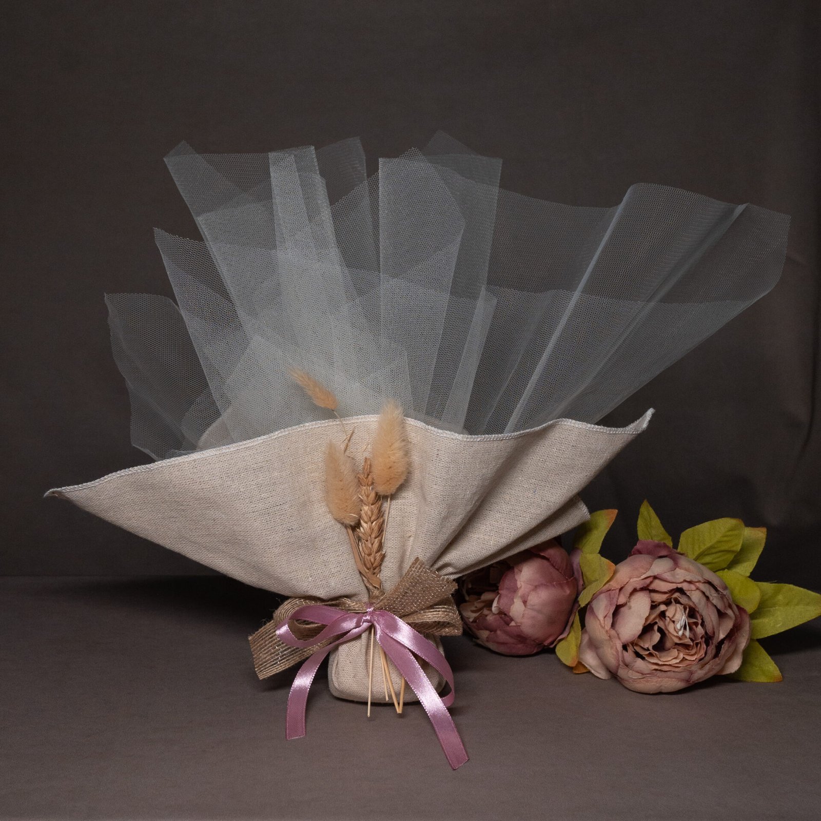 Μπομπονιέρα Γάμου Rustic με Λινάτσα, Στάχυ & Dusty Pink Κορδέλα