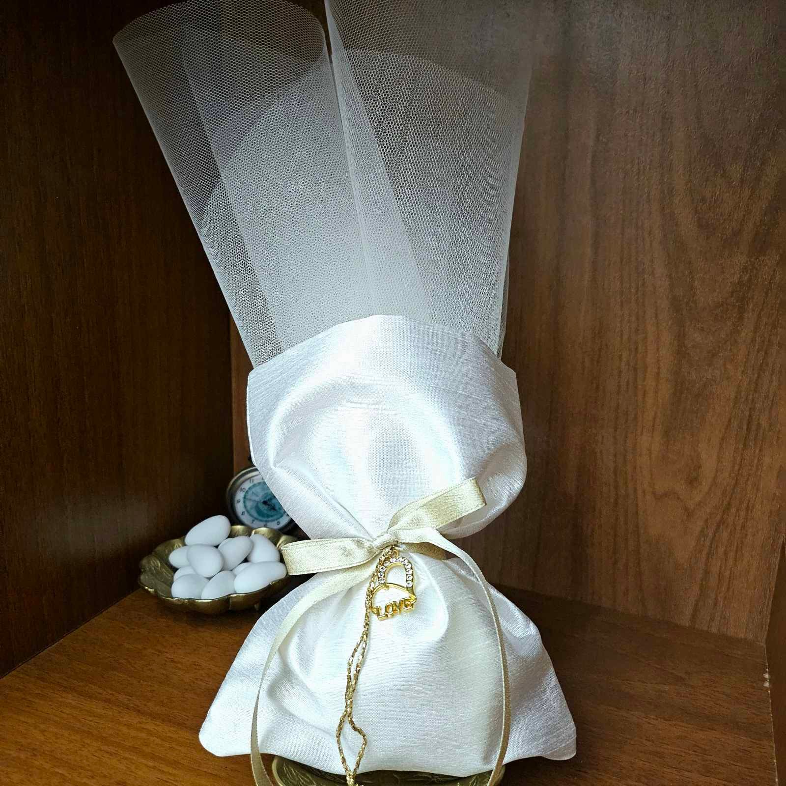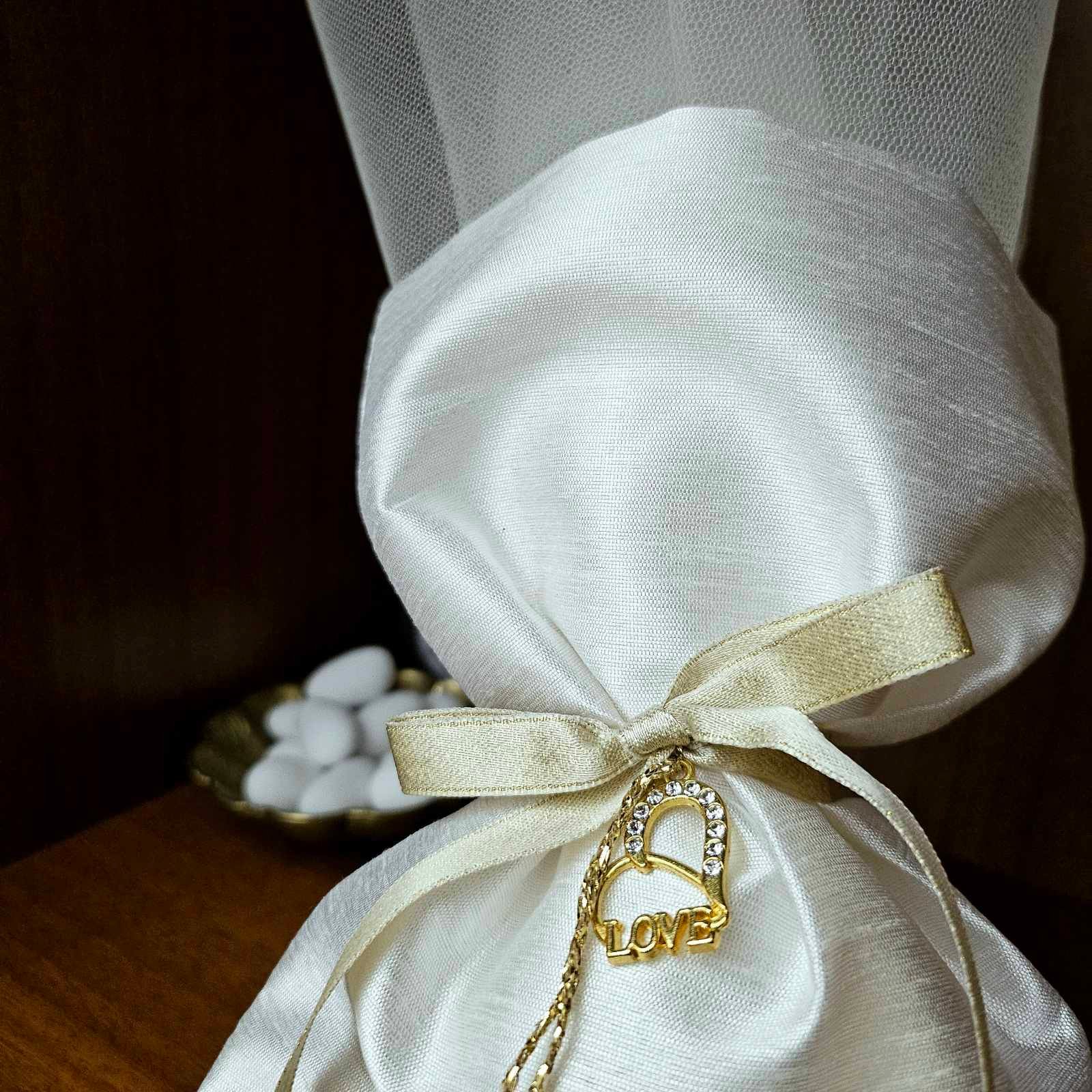 Μπομπονιέρα γάμου από πολυτελές ύφασμα σαντούκ, δεμένη με σατέν κορδέλα και χρυσό κρεμαστό “Love”. Ιδανική επιλογή για elegant γάμους, προσφέρει ένα εντυπωσιακό και διαχρονικό δώρο για τους καλεσμένους σας.