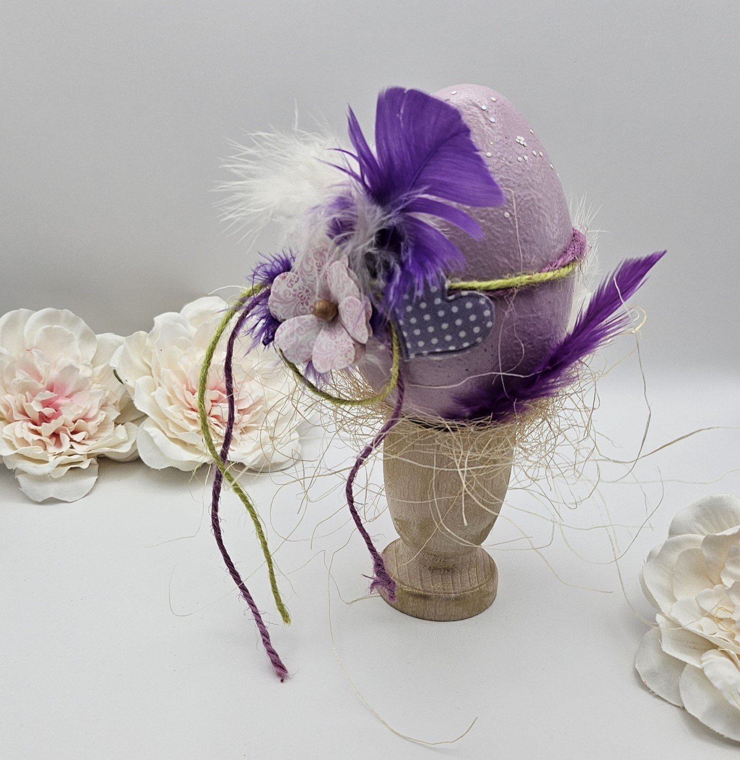 Χειροποίητο διακοσμητικό αυγό από foam σε παστέλ μωβ τόνους, στολισμένο με φτερά, λουλούδι και καρδιά, ιδανικό για χαρούμενη και ξεχωριστή πασχαλινή διακόσμηση.