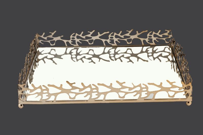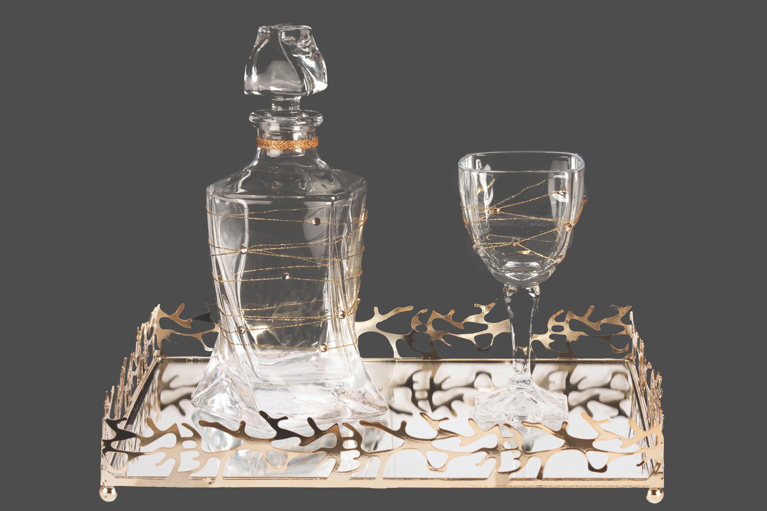 Εντυπωσιακό σετ γάμου που περιλαμβάνει καράφα (70,00) και ποτήρι με χρυσές λεπτομέρειες (18,00), τοποθετημένα σε πολυτελή δίσκο καθρέφτη με σχέδιο “κοράλι(110,00)”. Ιδανική επιλογή για μια κομψή και λαμπερή τελετή.