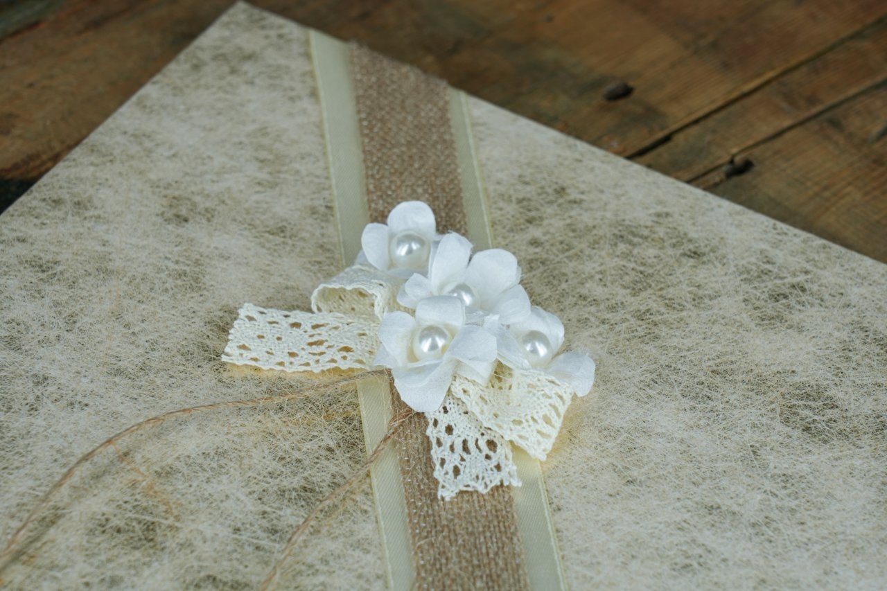 Χειροποίητο βιβλίο ευχών γάμου σε φυσικό μπεζ χρώμα, στολισμένο με κορδέλα λινάτσας, δαντέλα και λουλούδια από κουκούλι μεταξοσκώληκα με περλίτσες. Ρομαντική και ρουστίκ δημιουργία, ιδανική για να κρατήσει τις πιο όμορφες ευχές της μεγάλης σας ημέρας.