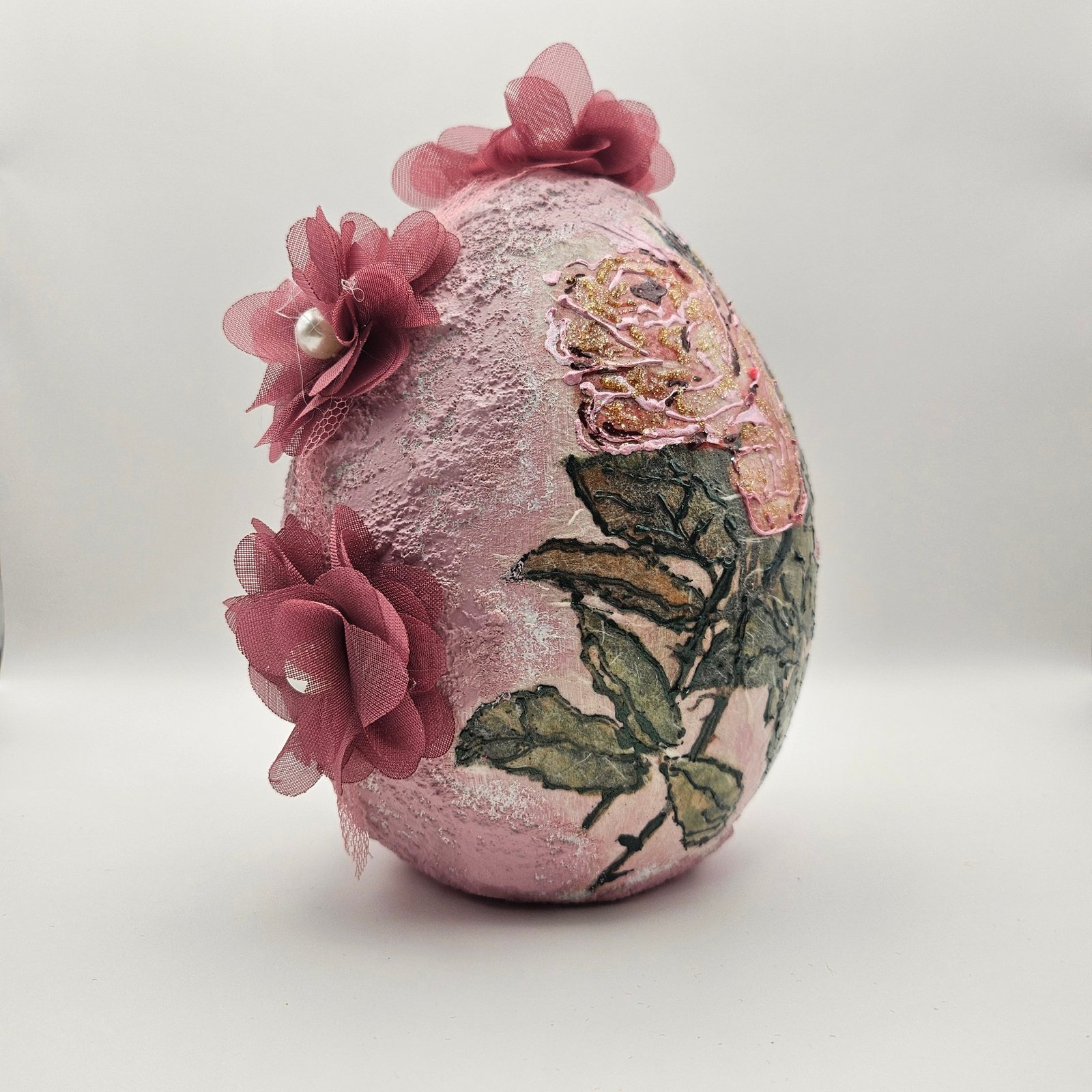 Χειροποίητο πορσελάνινο διακοσμητικό αυγό σε ρομαντικές ροζ αποχρώσεις, με ανάγλυφα λουλουδάτα σχέδια και υφασμάτινα άνθη, ιδανικό για κομψή πασχαλινή διακόσμηση ή ξεχωριστό δώρο.