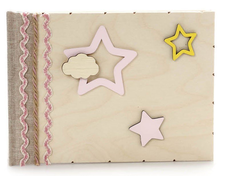 Ευχολόγιο βάπτισης με ξύλινο εξώφυλλο, διακοσμημένο με αστέρια και συννεφάκι σε απαλά παστέλ χρώματα.