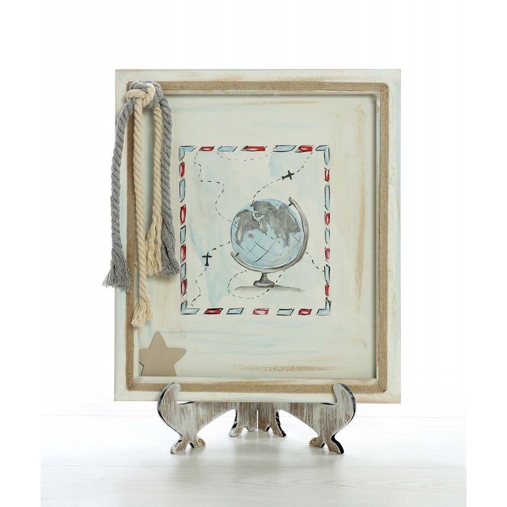 Ξύλινο ευχολόγιο βάπτισης με θέμα την υδρόγειο και τα ταξίδια. Διακοσμημένο με αεροπλανάκια, σχοινιά και ρετρό σχέδιο σε αποχρώσεις γαλάζιου και μπεζ. Μια ιδανική επιλογή για αγοράκι με θέμα ταξίδι ή περιπέτεια.
