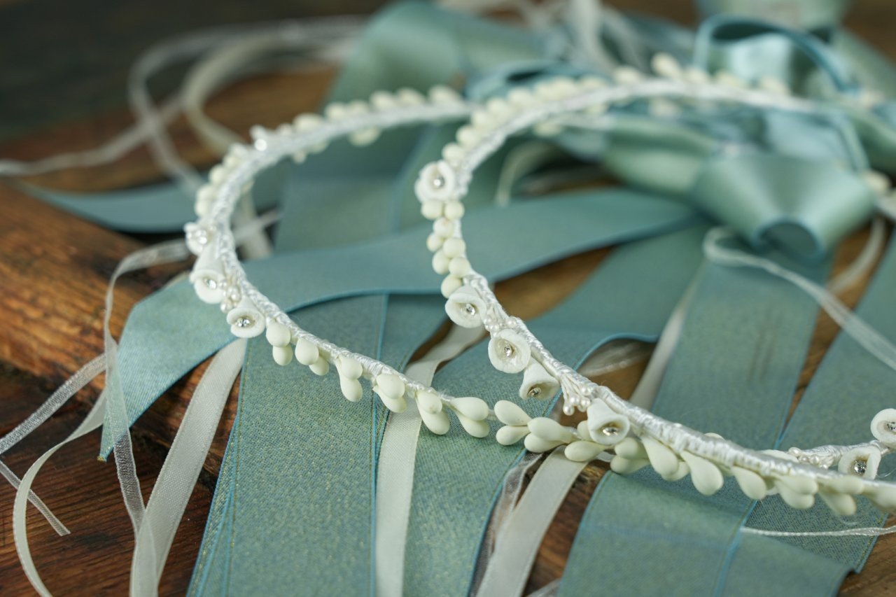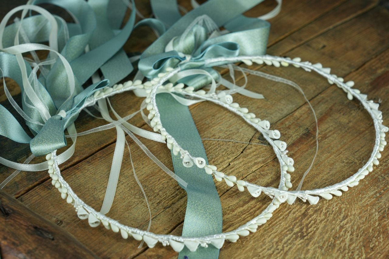 Χειροποίητα στέφανα γάμου, διακοσμημένα με πορσελάνινα λουλούδια και λεπτά φύλλα. Με φίνο λευκό φινίρισμα και δεμένα με ιριδίζουσα κορδέλα, προσφέρουν ρομαντική, εκλεπτυσμένη και απόλυτα διαχρονική αισθητική.