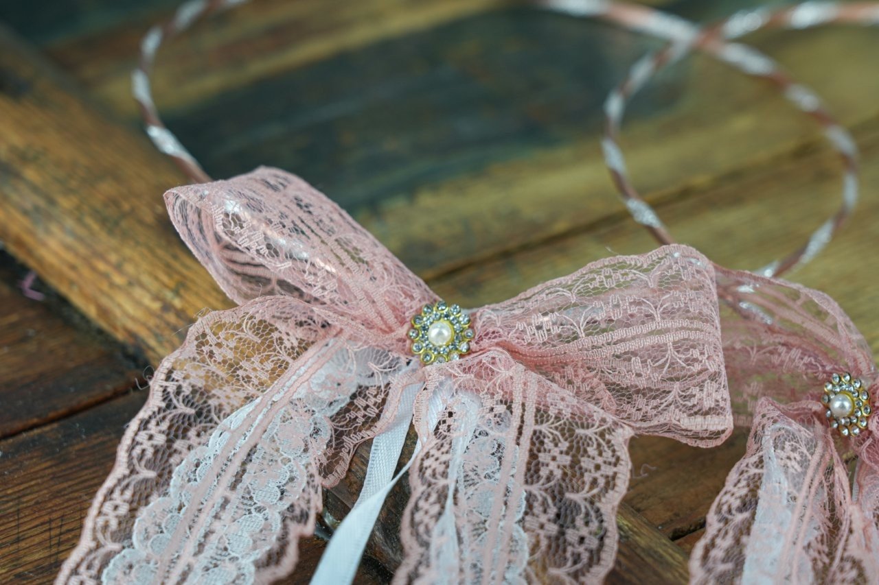 Στέφανα γάμου σε ροζ χρυσό δεμένα με σομόν και λευκές δαντέλες, διακοσμημένες με λουλουδάκι τύπου στρας με πέρλα.