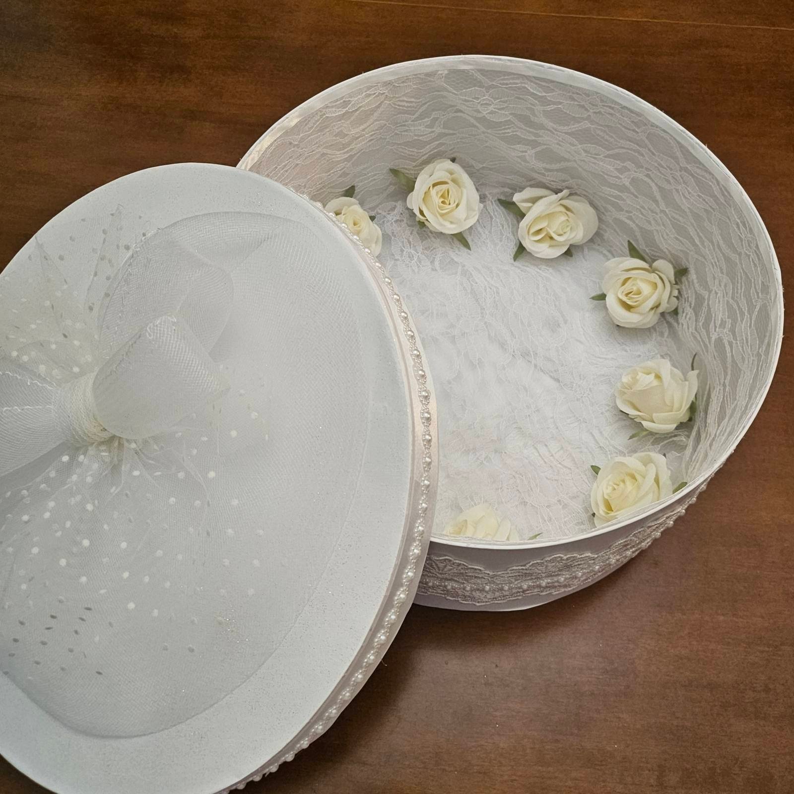 Νυφική Καπελιέρα Λευκή με Δαντέλα & Τούλι – Πολυτελές Κουτί Γάμου