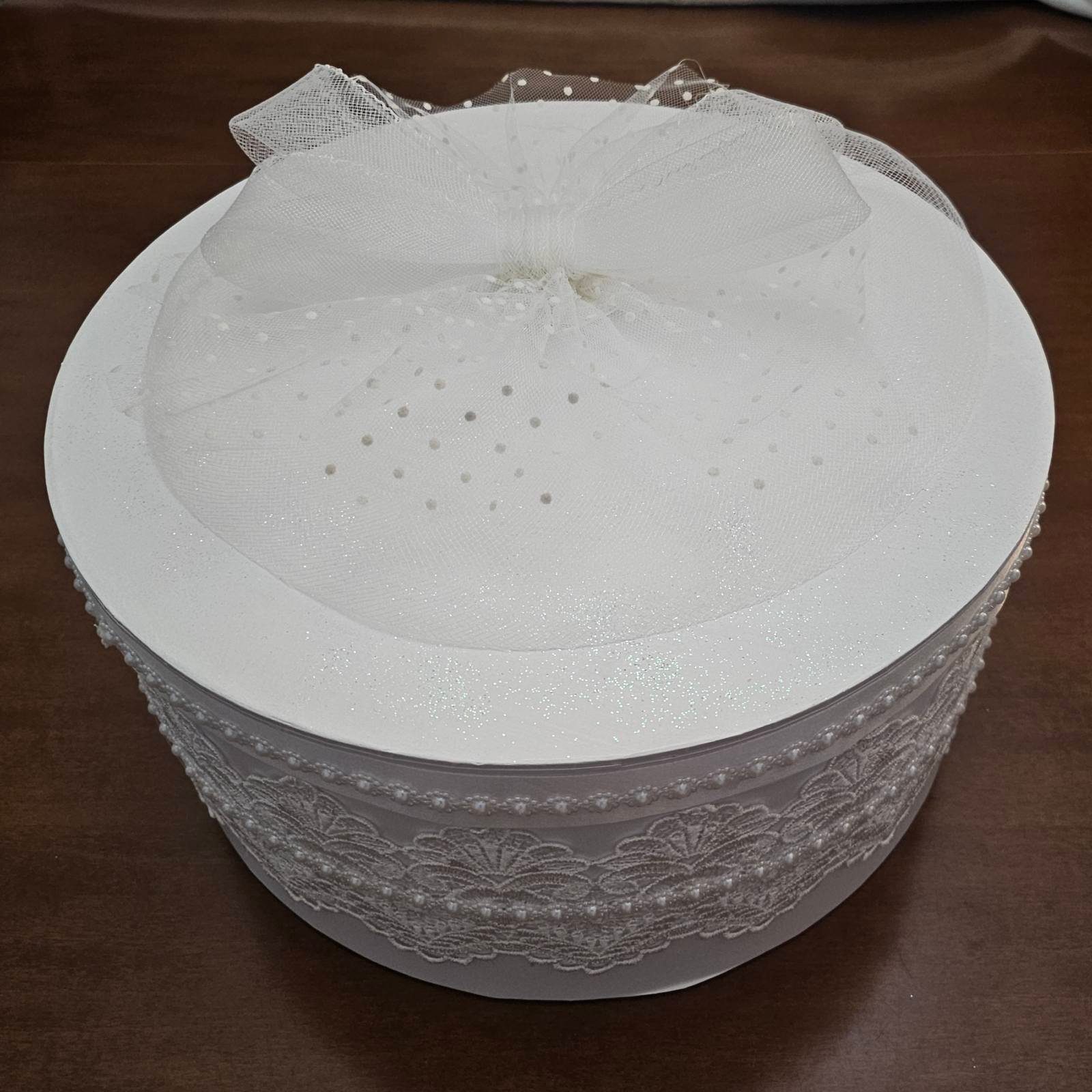 Εντυπωσιακή νυφική καπελιέρα σε λευκό χρώμα, διακοσμημένη με φίνα δαντέλα, περλέ λεπτομέρειες και κομψό τούλι. Ένα πολυτελές κουτί αποθήκευσης ιδανικό για στέφανα ή παπούτσια νύφης.