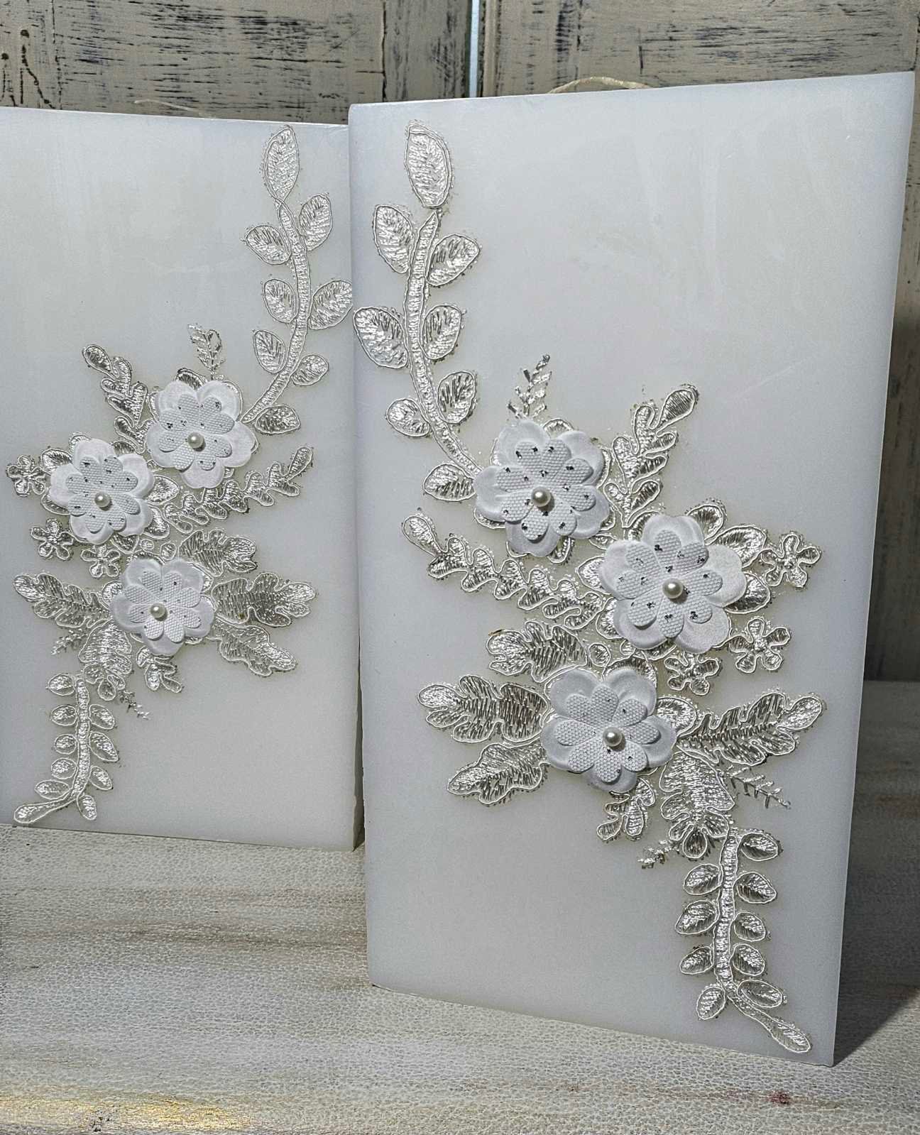 Ρομαντισμός και φινέτσα σε κάθε λεπτομέρεια! Τα κεριά γάμου με ανάγλυφα λουλούδια, ασημί φύλλα και μαργαριταρένιες πινελιές δημιουργούν μια elegant ατμόσφαιρα που ταιριάζει απόλυτα σε μια ξεχωριστή τελετή.(διαστ.15*15*30)
