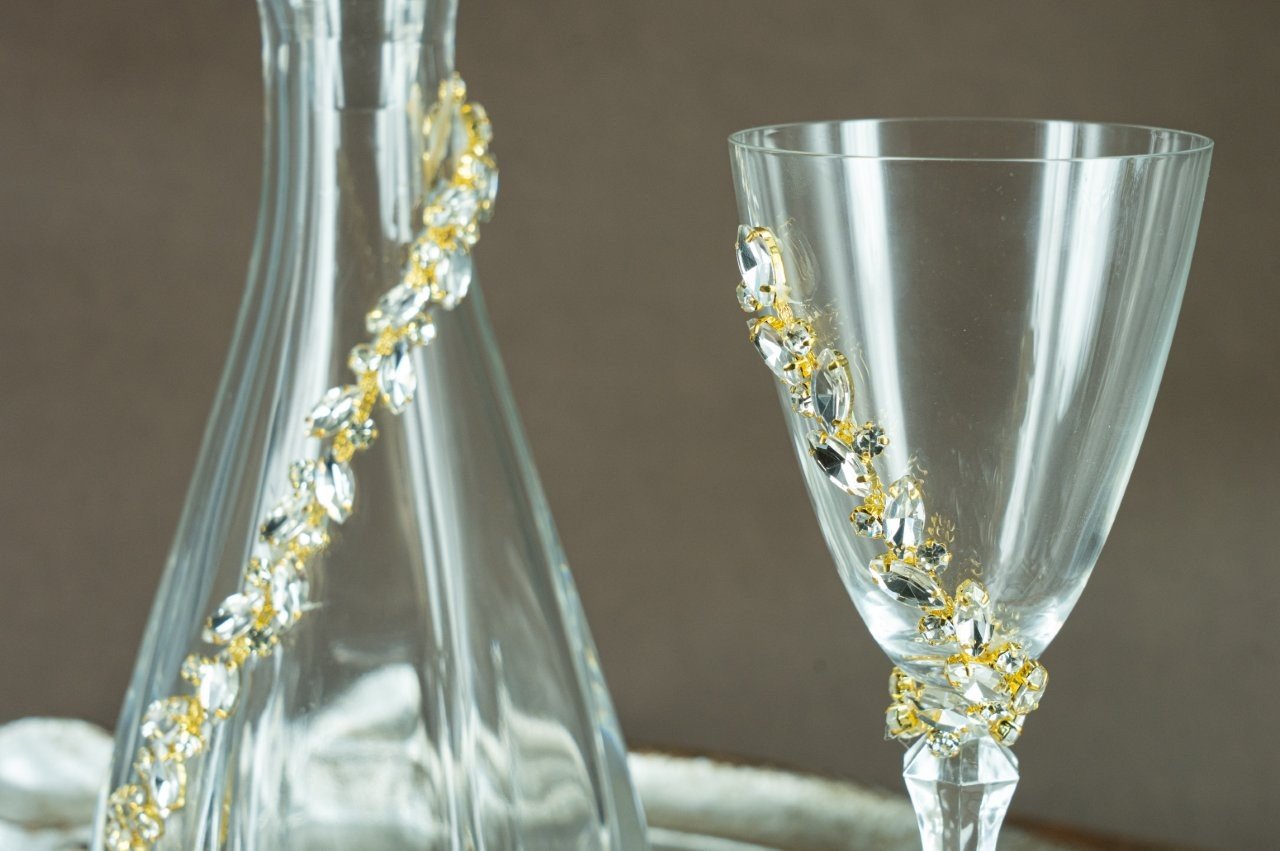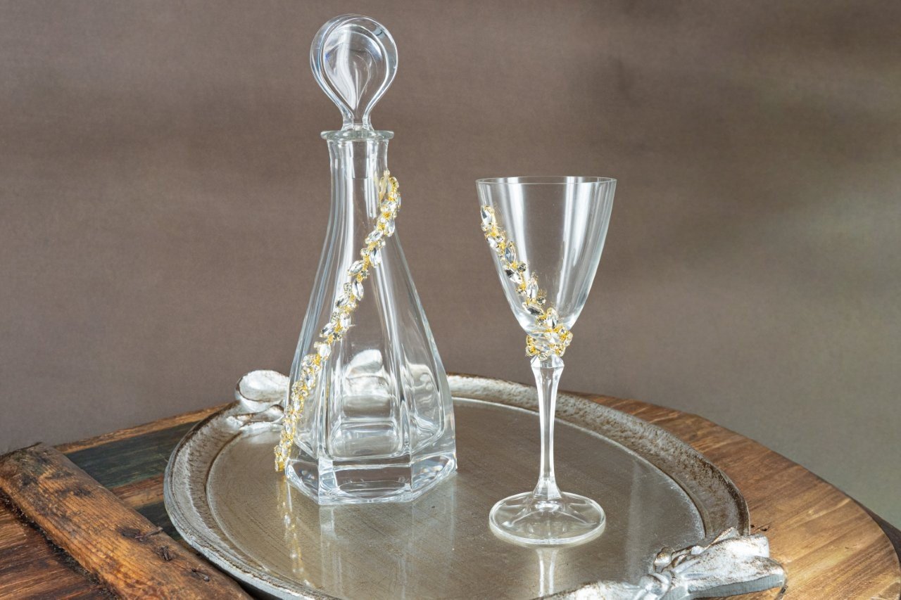 Κομψό Σετ Γάμου Καράφα, Ποτήρι & Δίσκος με Χρυσές Λεπτομέρειες