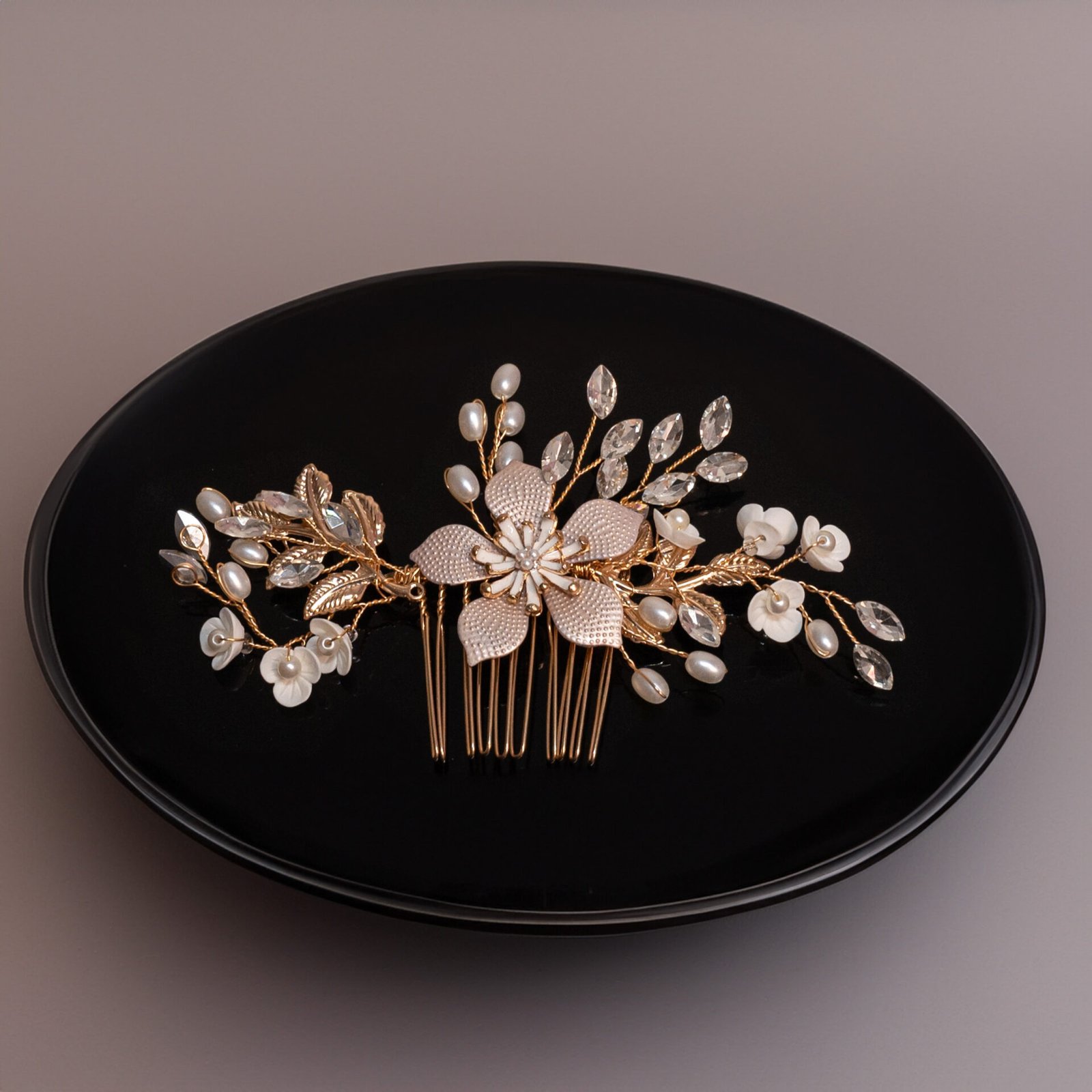 Νυφικό χτενάκι μαλλιών με κεντρικό λουλούδι, στολισμένη με πέρλες, κρυστάλλους και χρυσές λεπτομέρειες. Ένα εκλεπτυσμένο αξεσουάρ που χαρίζει κομψότητα, λάμψη και ρομαντισμό σε κάθε bridal χτένισμα.