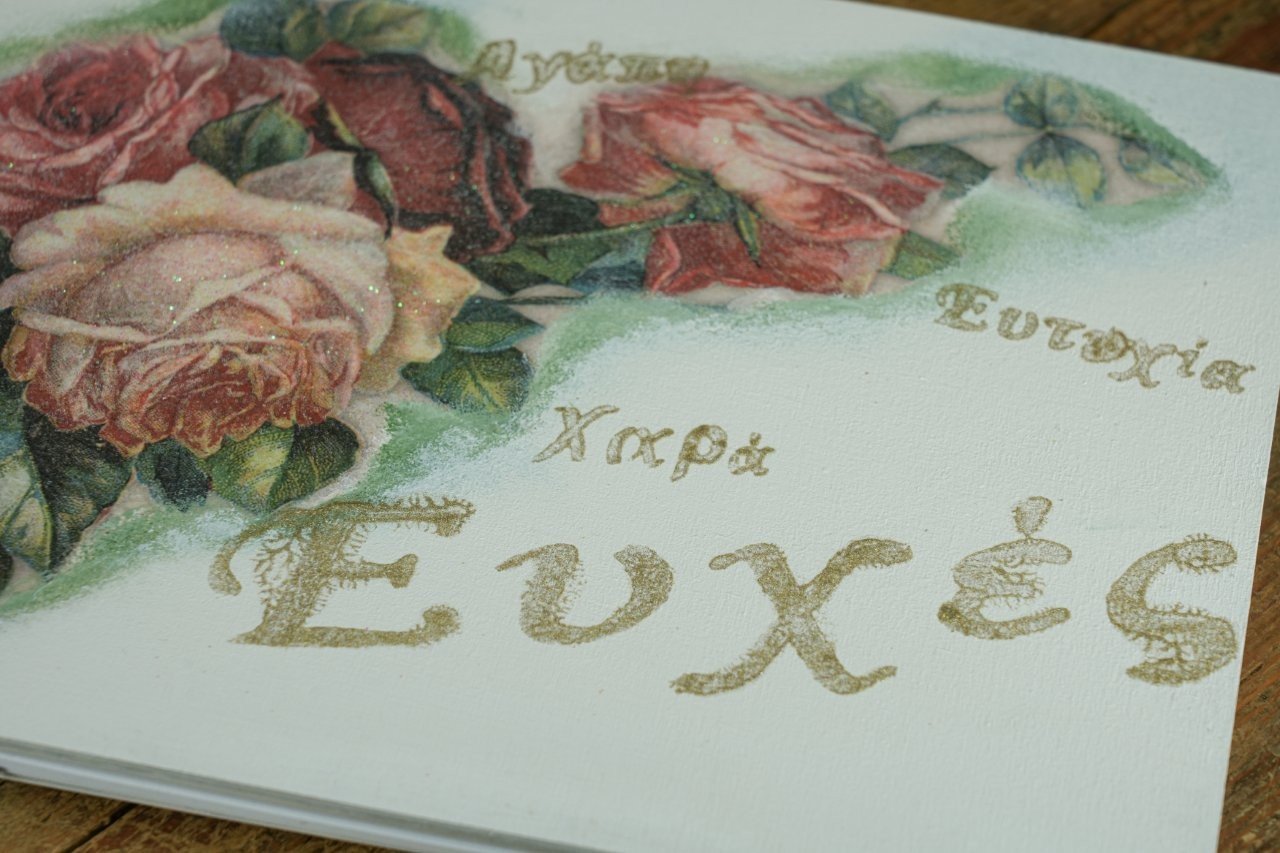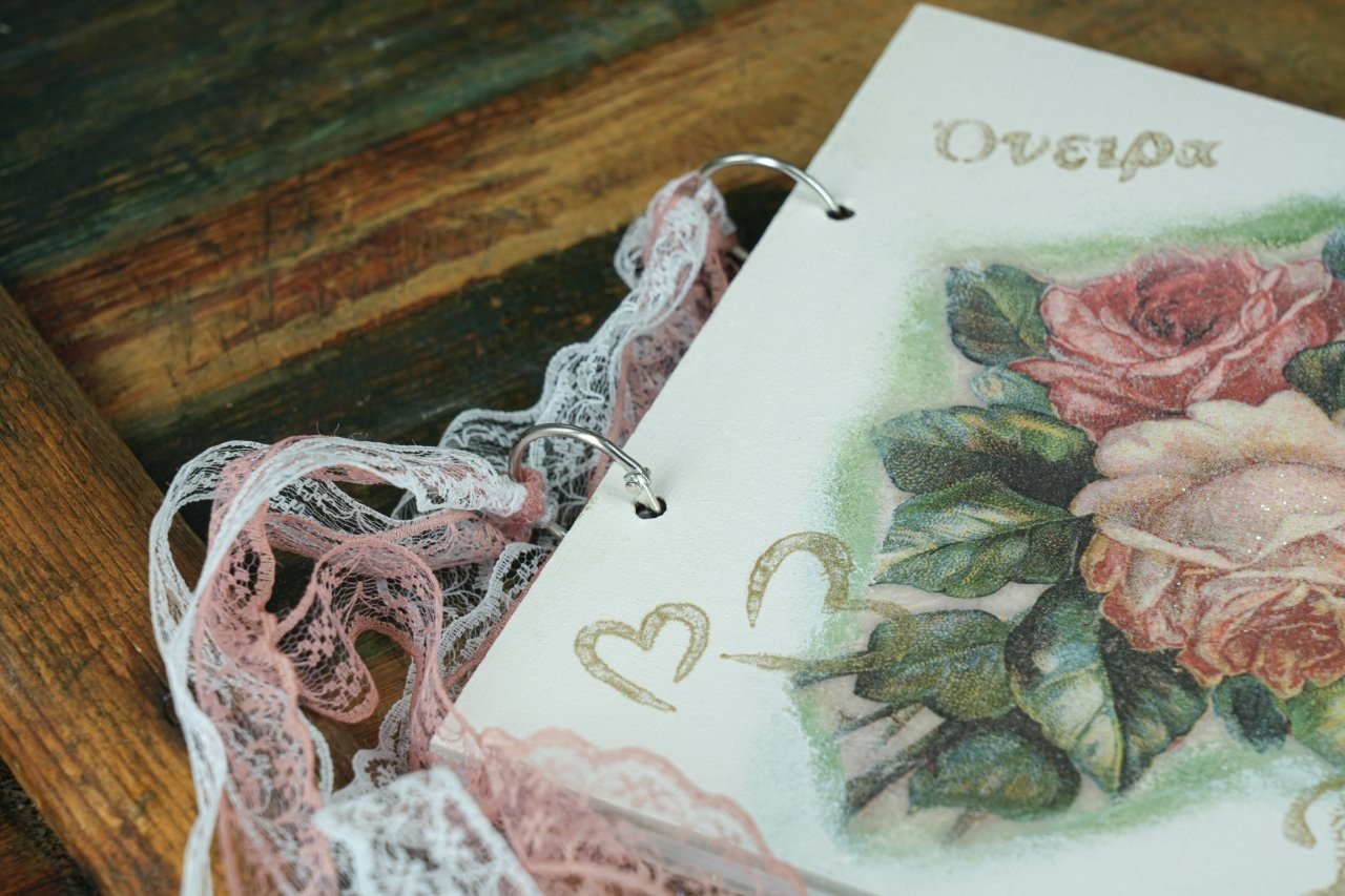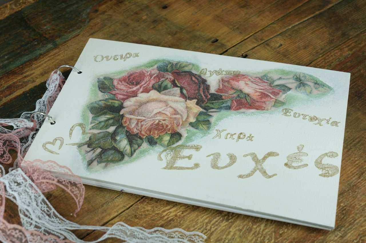 Χειροποίητο βιβλίο ευχών γάμου με τεχνική ντεκουπάζ, με ροζ τριαντάφυλλα, λέξεις γεμάτες αγάπη και κορδέλες δαντέλας. Ρομαντική και καλλιτεχνική δημιουργία, ιδανική για να κρατήσει ζωντανές τις ευχές της πιο ξεχωριστής ημέρας.