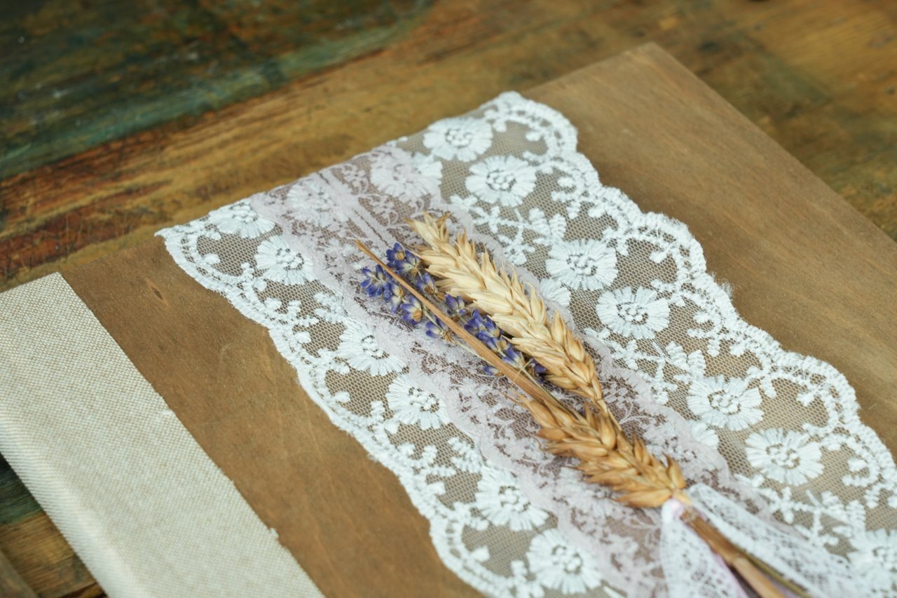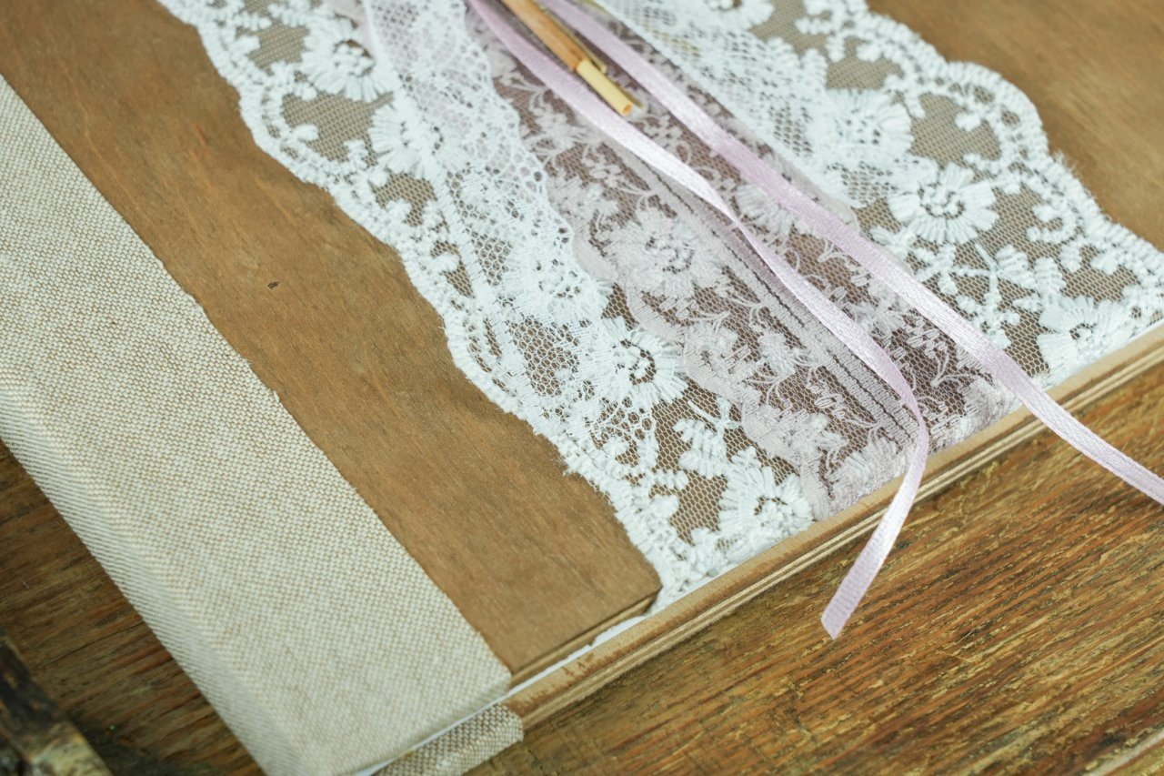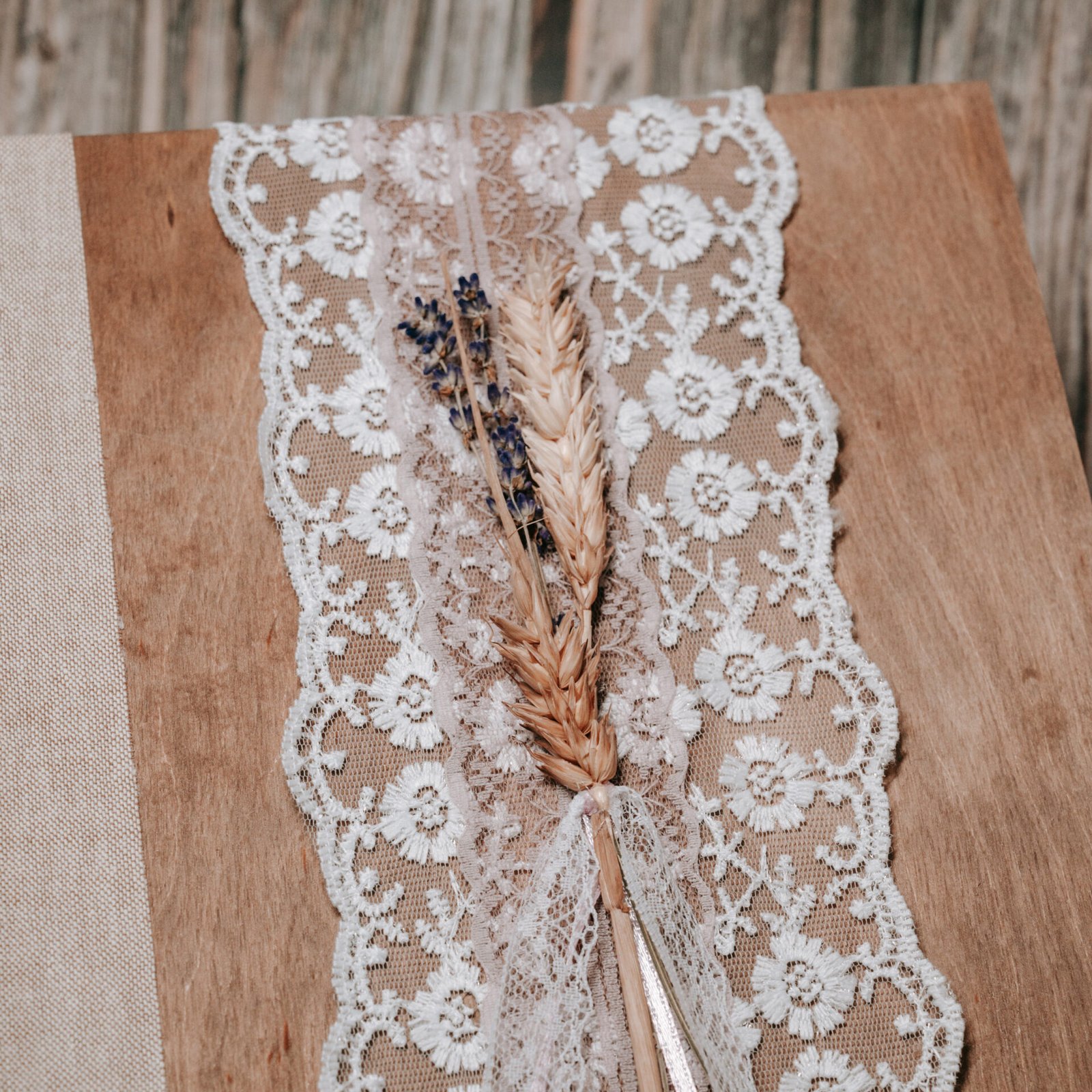 Ξύλινο χειροποίητο βιβλίο ευχών γάμου, με δαντέλα και λεπτομέρειες λεβάντας και σταχυών. Μια ξεχωριστή επιλογή για rustic και boho γάμους με φυσική κομψότητα.