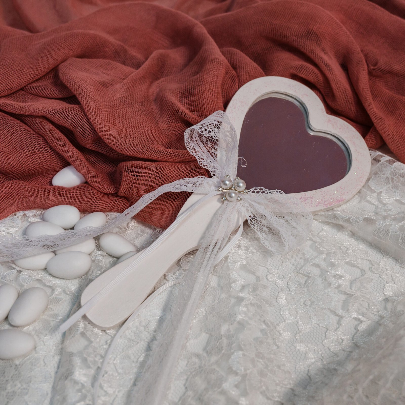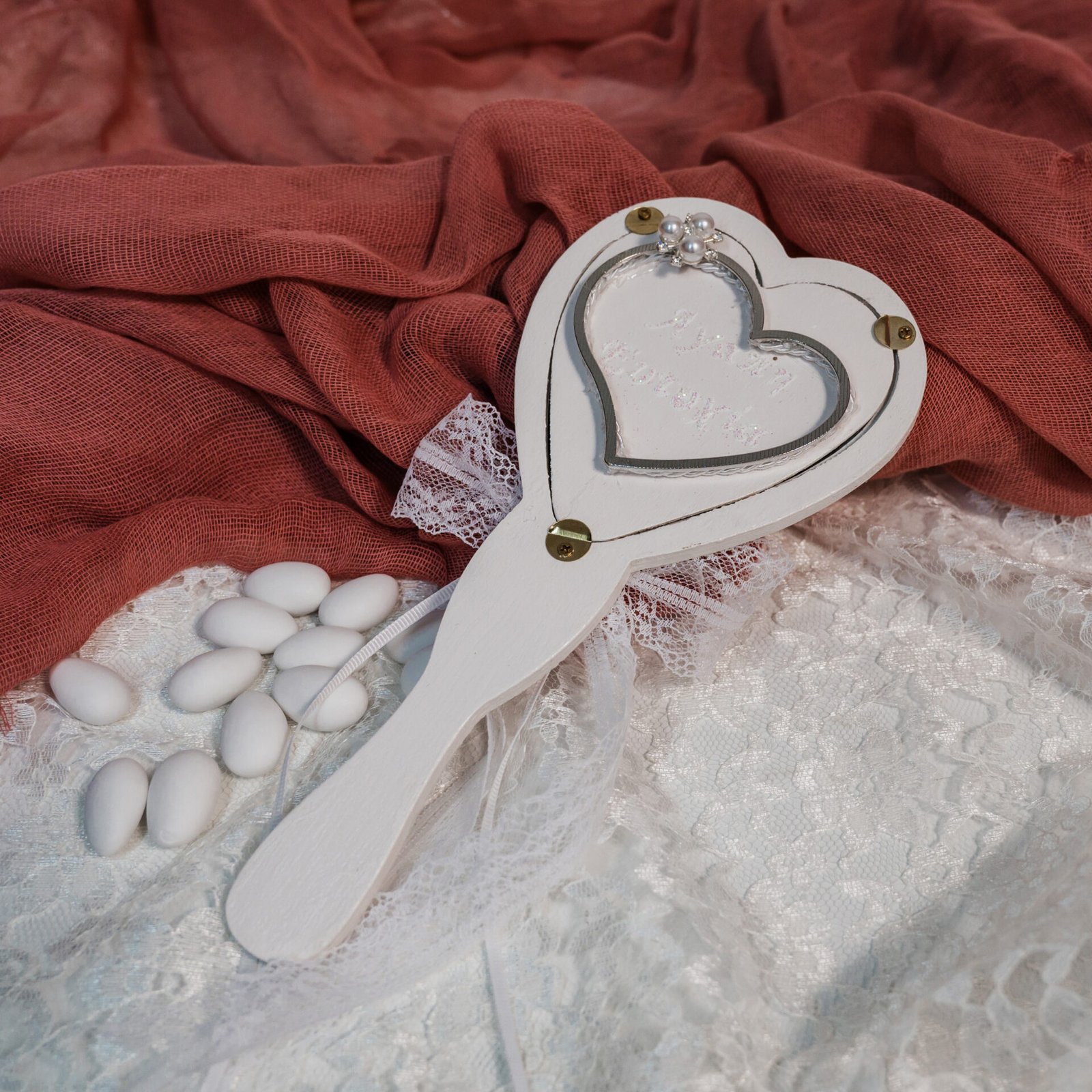 Νυφικό Καθρεφτάκι Καρδιά με Δαντέλα & Πέρλες