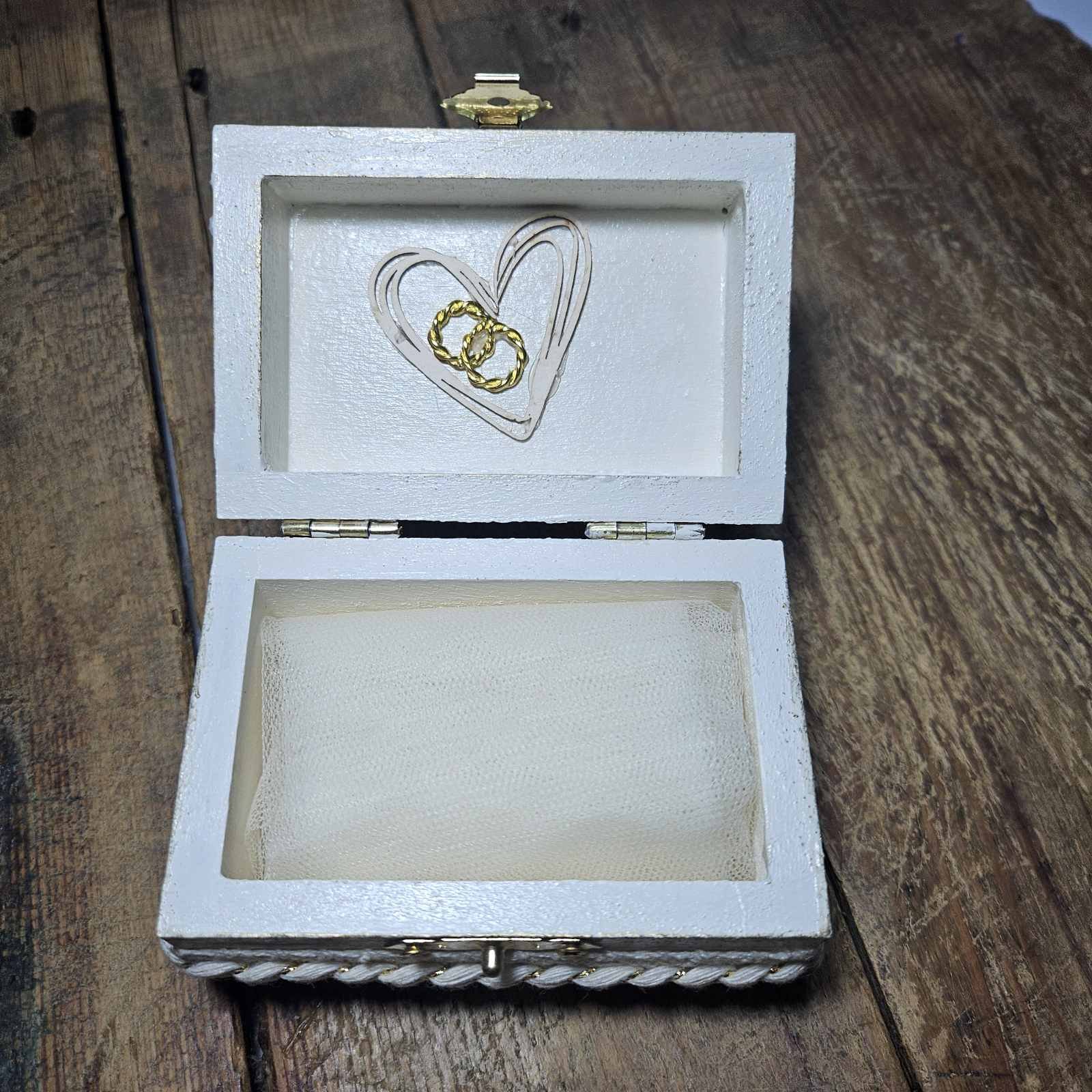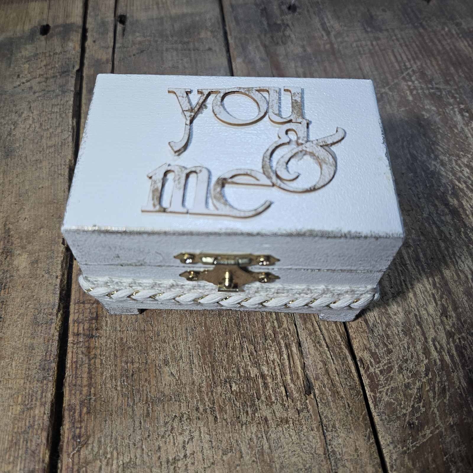 Ξύλινη βεροθήκη σε λευκό αντικέ με ανάγλυκη επιγραφή You & Me και πλεχτή διακόσμηση στη βάση. Μια ρομαντική και μοντέρνα χειροποίητη δημιουργία, ιδανική για την κομψή παρουσίαση και φύλαξη των βερών του γάμου.