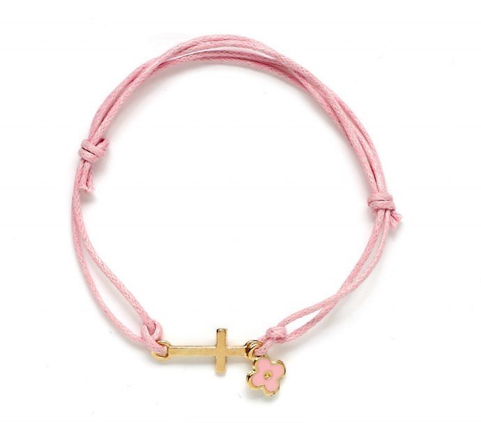 Μαρτυρικό βραχιολάκι με ροζ κορδόνι, χρυσό σταυρό και κρεμαστό λουλουδάκι σε ροζ σμάλτο. Ιδανικό για κοριτσίστικη βάπτιση, κομψό και διακριτικό, φοριέται εύκολα και μετά τη βάπτιση ως stylish κόσμημα.