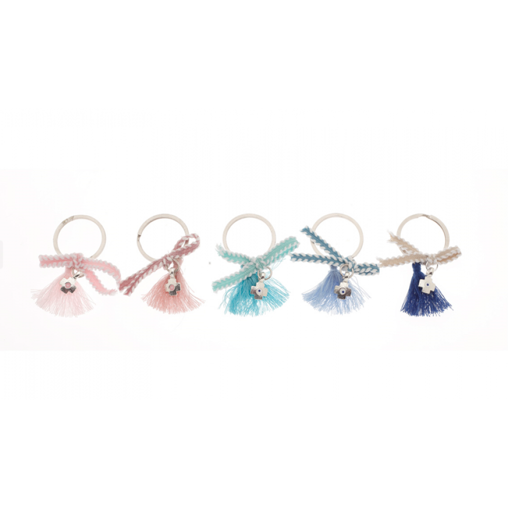 Χαριτωμένα μπρελόκ-μαρτυρικά βάπτισης με χρωματιστή φουντίτσα, πλεκτή κορδέλα και μεταλλικό λουλουδάκι.