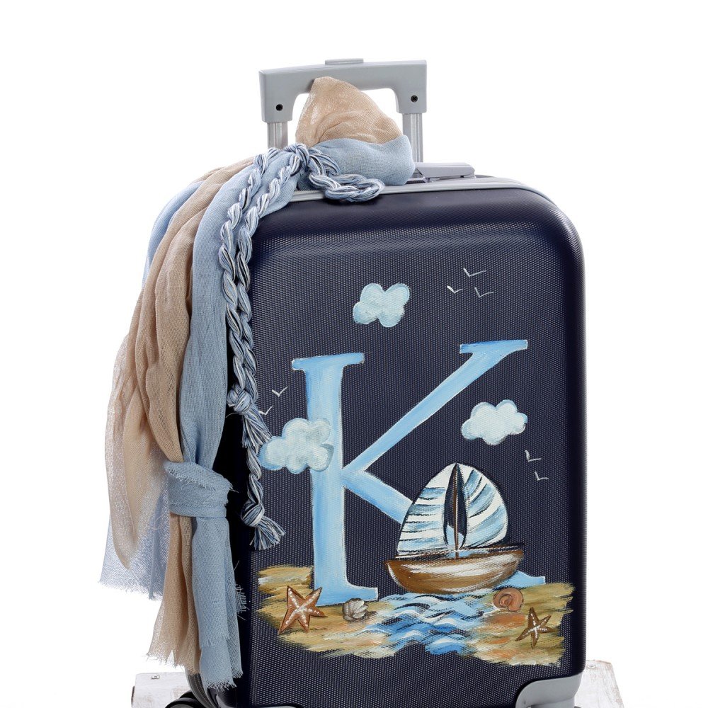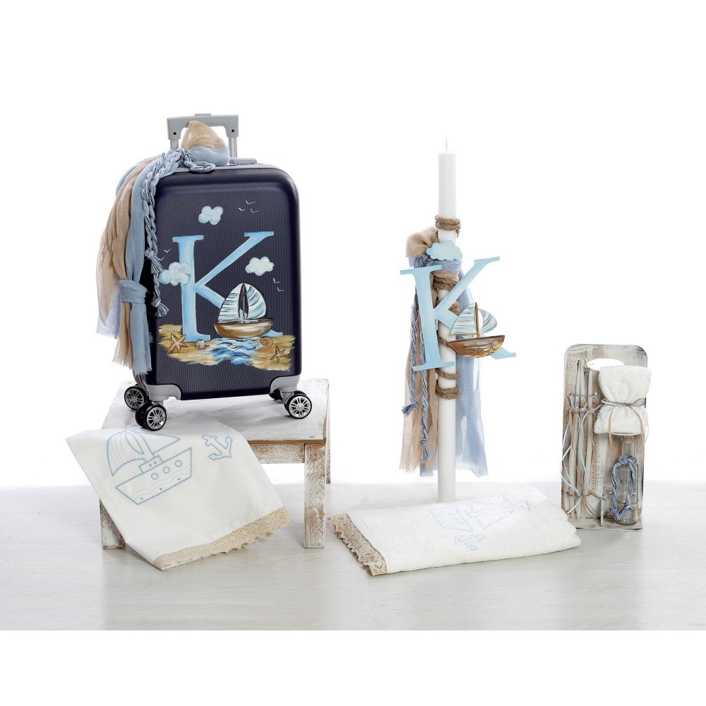 Βαλίτσα τρόλεϊ βάπτισης διακοσμημένη με ναυτικό θέμα, καραβάκι και μονόγραμμα.