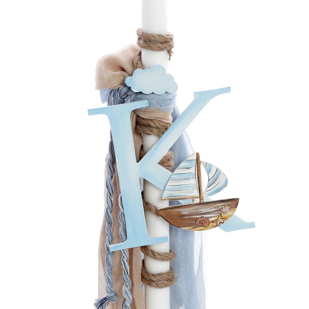 Λαμπάδα βάπτισης με ξύλινο καραβάκι και υφάσματα σε μπλε και μπεζ τόνους.
