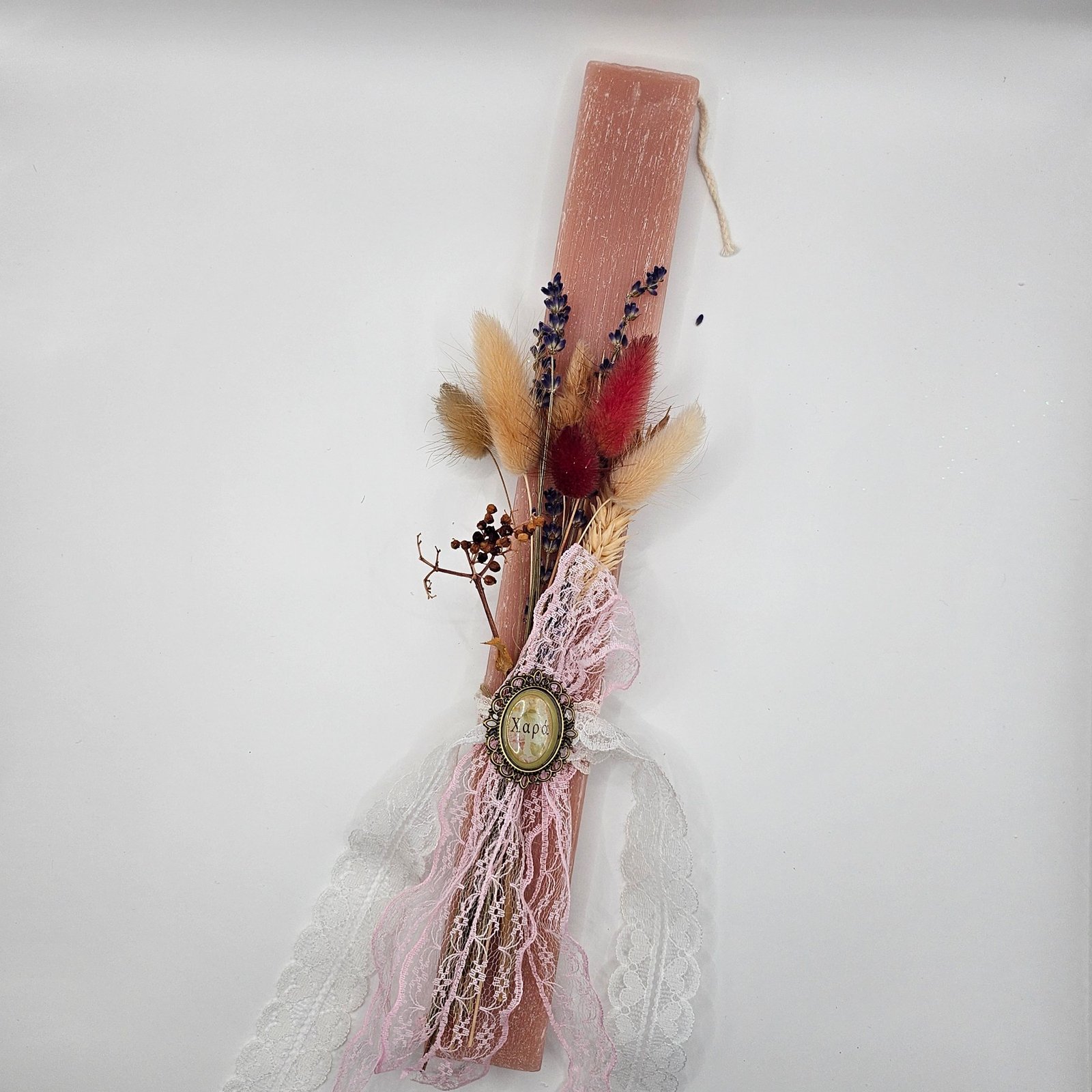 Χειροποίητη, πολύ αρωματική πασχαλινή λαμπάδα σε απαλές ροζ αποχρώσεις, διακοσμημένη με αποξηραμένα λουλούδια και boho λεπτομέρειες, ιδανική για ένα φυσικό και ξεχωριστό πασχαλινό δώρο.