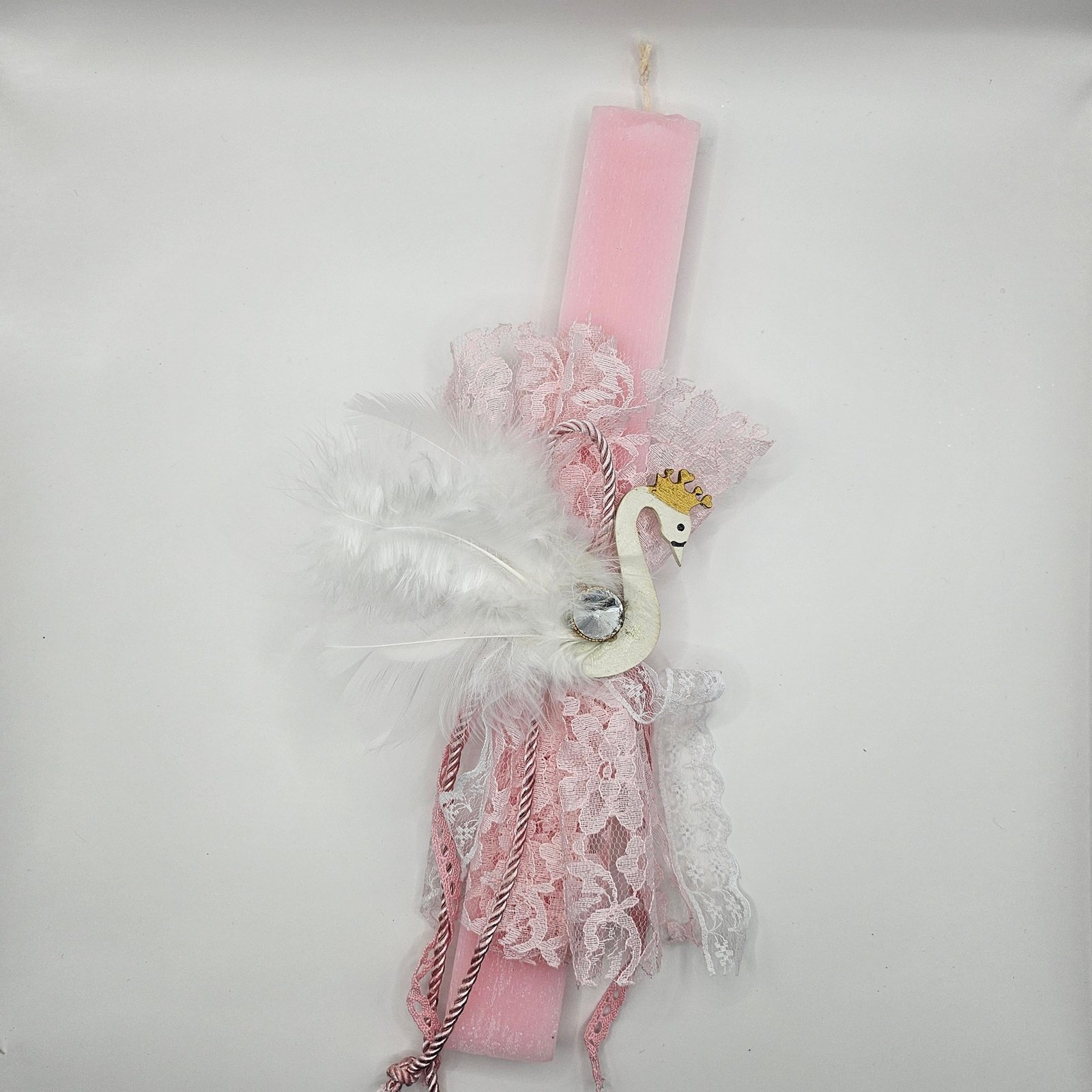 Χειροποίητη, πολύ αρωματική πασχαλινή λαμπάδα σε ροζ αποχρώσεις, διακοσμημένη με κύκνο, δαντέλα και απαλά φτερά για ένα ονειρικό, πριγκιπικό πασχαλινό δώρο.