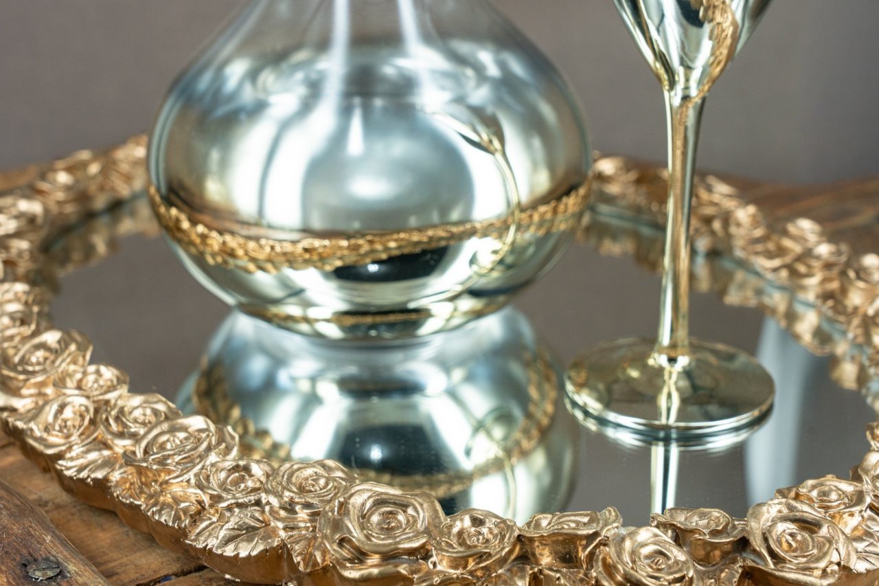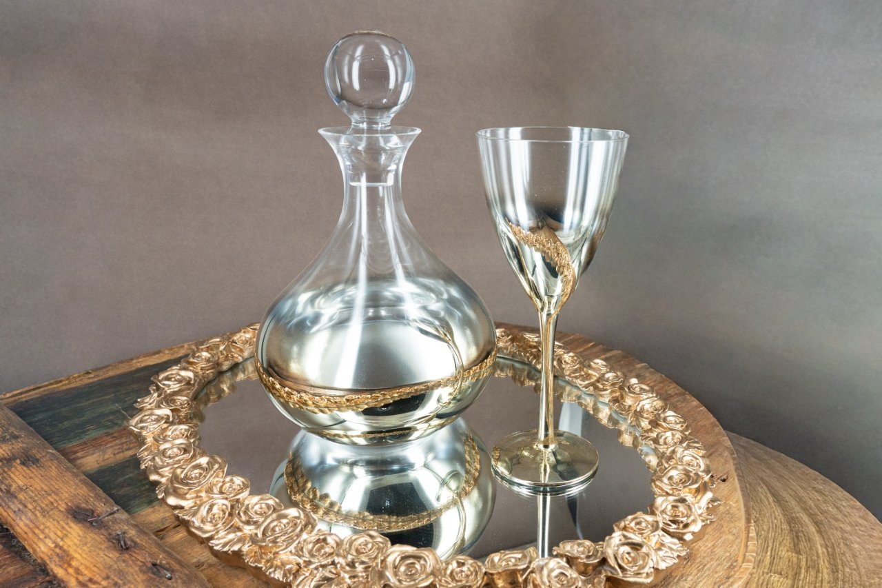 Πολυτελές Σετ Γάμου Καράφα, Ποτήρι & Δίσκος με Χρυσή Διακόσμηση