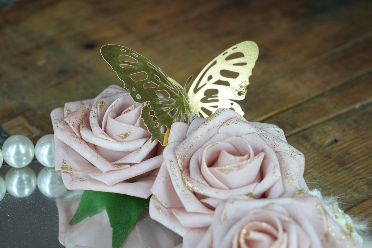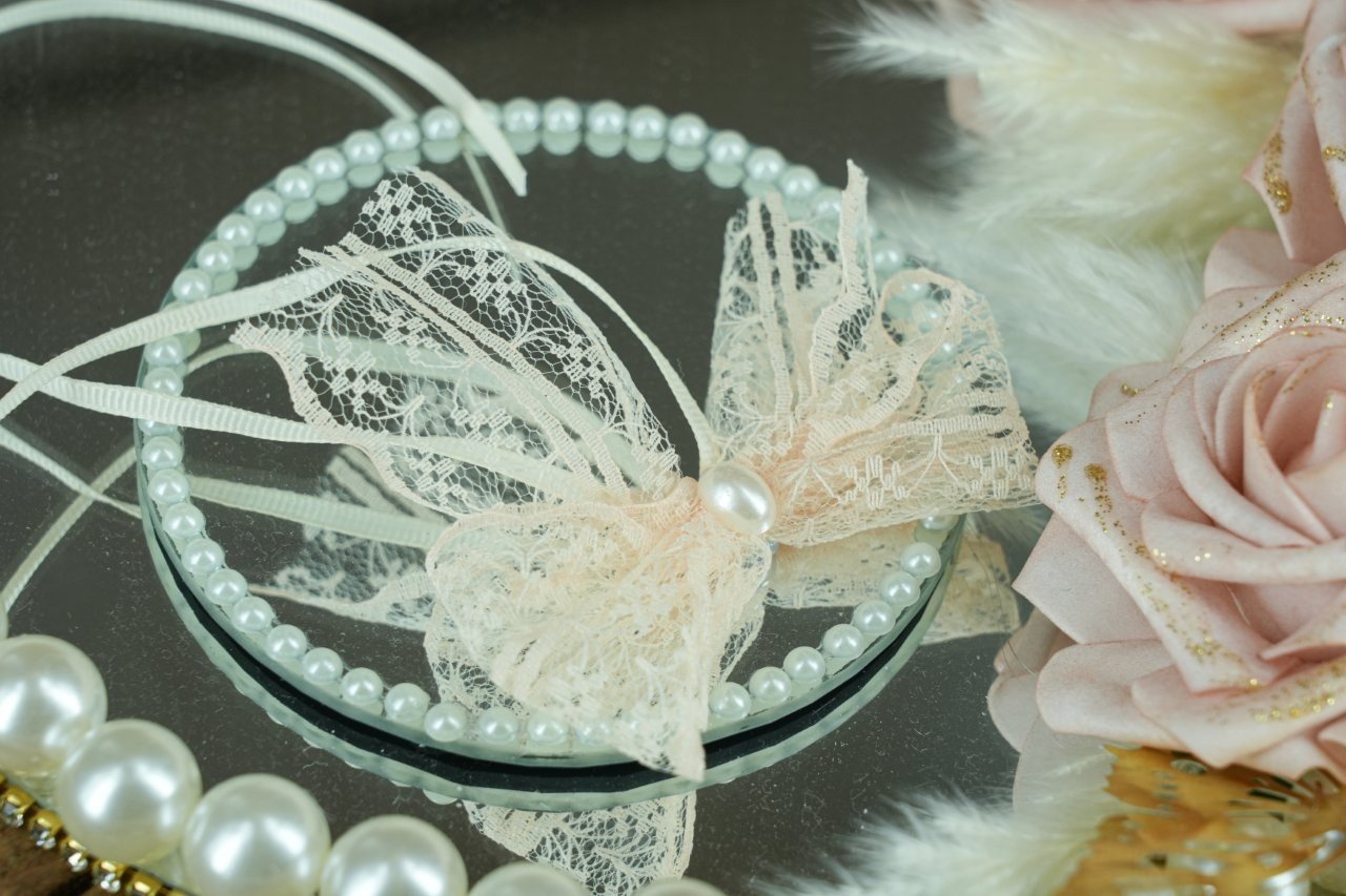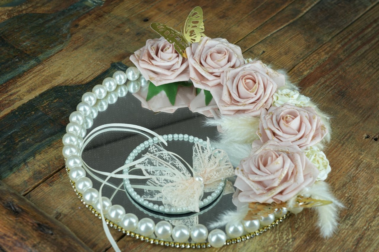 Εντυπωσιακή βεροθήκη με καθρέφτη, λουλούδια και πέρλες που αναδεικνύει μοναδικά τις βέρες σας, χαρίζοντας ρομαντισμό και κομψότητα στη στιγμή που θα θυμάστε για πάντα.