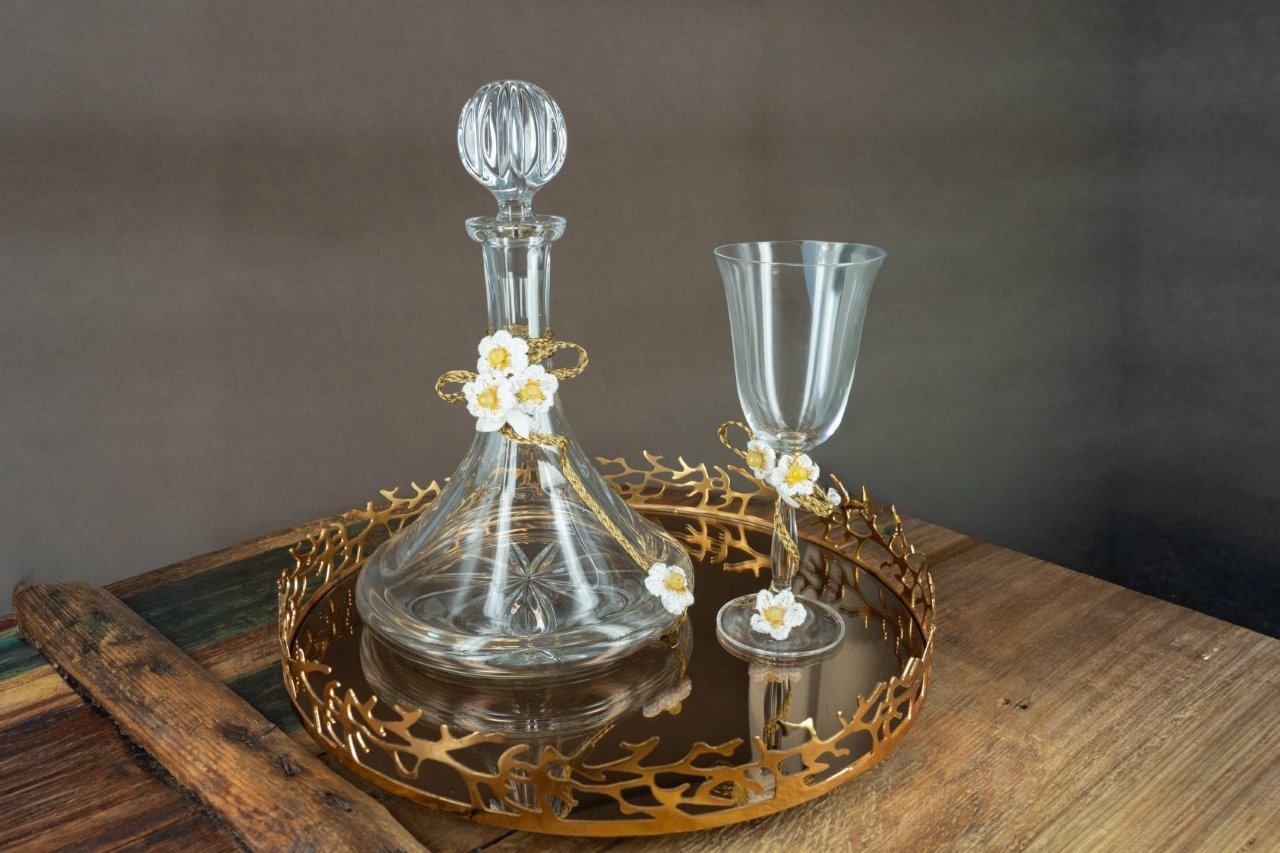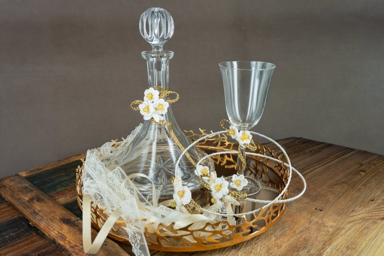 Ρομαντικό Σετ Γάμου με Χειροποίητα Πλεκτά Λουλούδια – Καράφα, Ποτήρι & Χρυσός Δίσκος