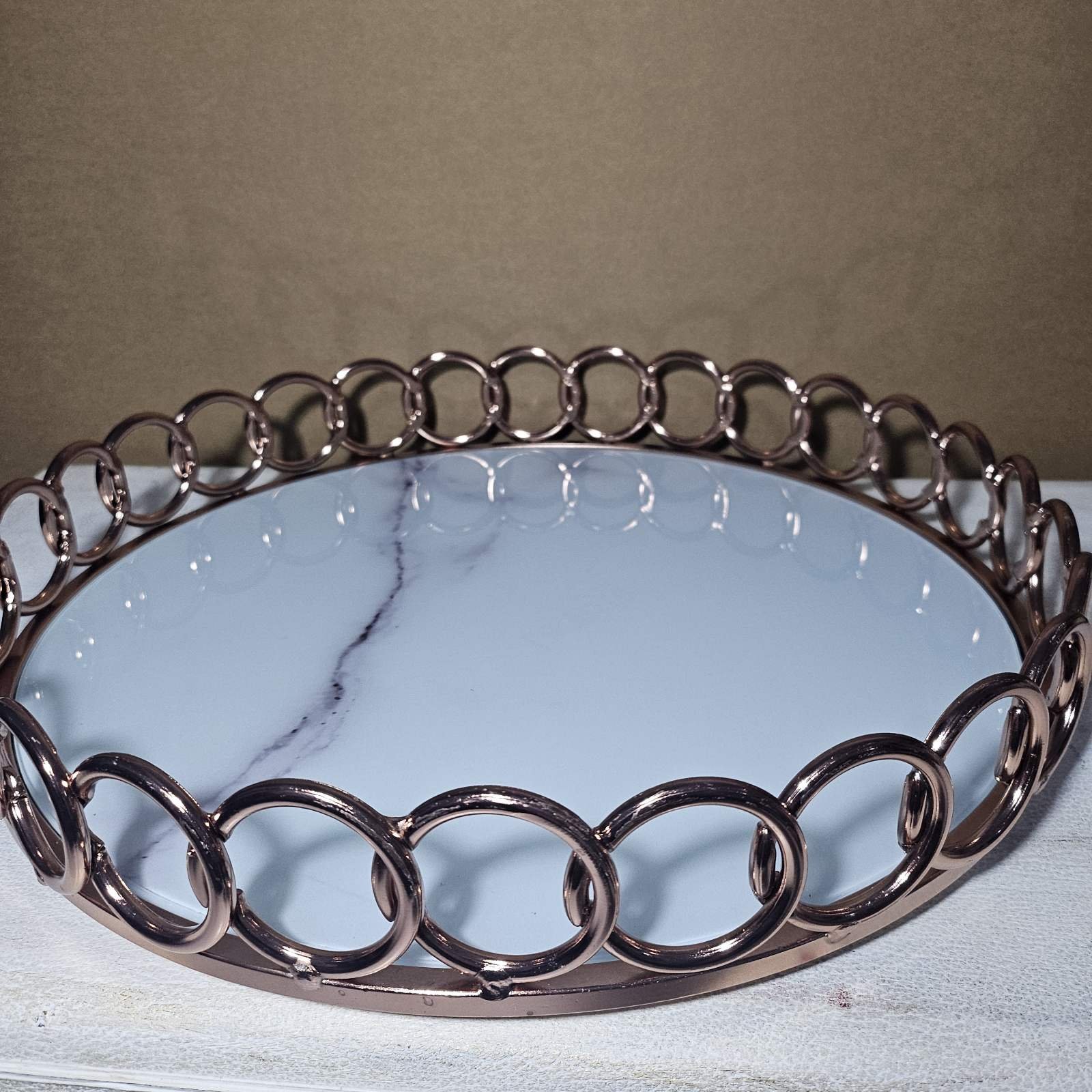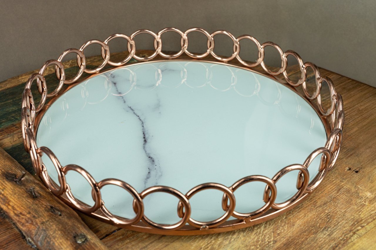 Σετ καράφα και ποτήρι με κομψές ροζ χρυσές λεπτομέρειες (69,00), τοποθετημένα σε στρογγυλό δίσκο με μοντέρνο σχέδιο κρίκων και εφέ μαρμάρου (95,00).