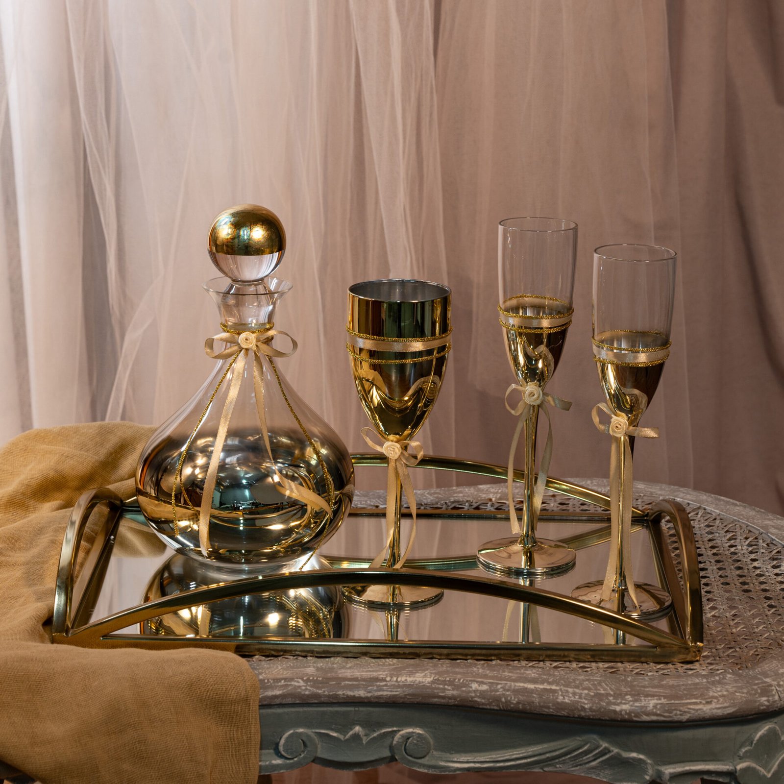 Εντυπωσιακό σετ καράφας, ποτηριών και δίσκου με πολυτελείς χρυσές λεπτομέρειες. Η καράφα και το ποτήρι κρασιού (74,00) στολίζονται με διακριτικές χρυσές γραμμές και κορδέλες, καθώς και τα ποτήρια σαμπάνιας ( 37,00), ενώ ο καθρέφτης του δίσκου (84,00) αναδεικνύει ακόμα περισσότερο τη λάμψη του σετ.