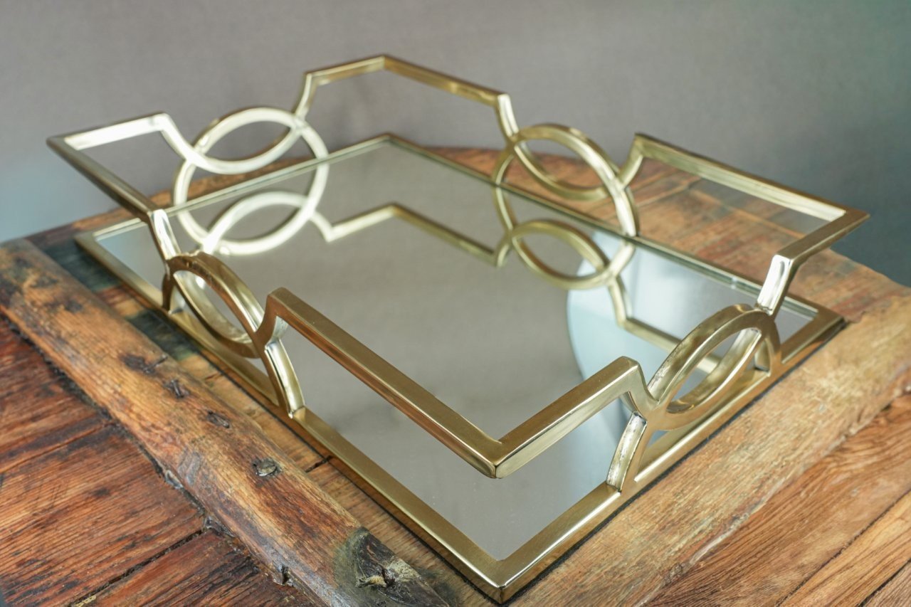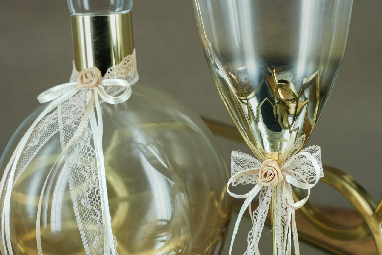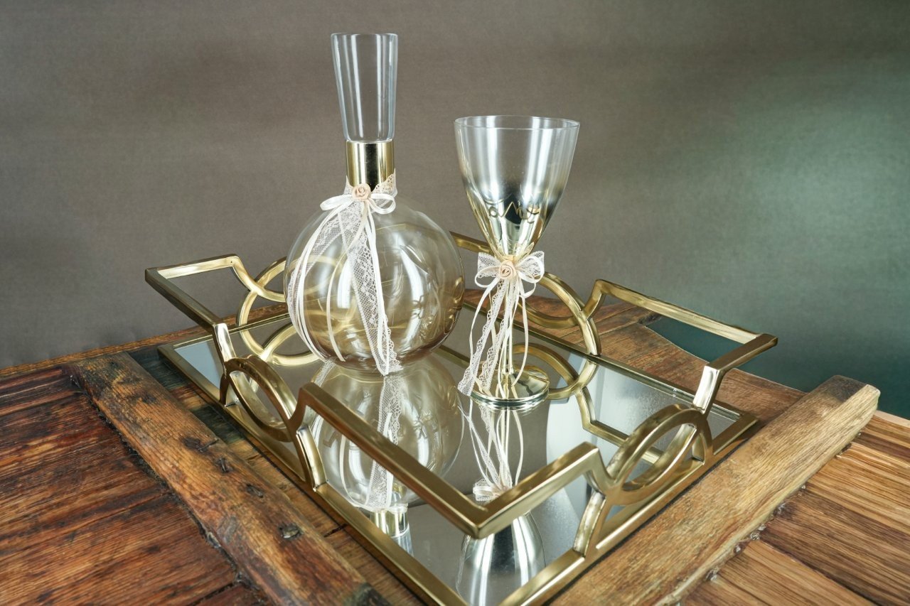Κομψό σετ γάμου με δίσκο (80,00), καράφα (50,00) και ποτήρι (20,00) διακοσμημένα με χρυσές λεπτομέρειες και ρομαντικές δαντελένιες κορδέλες, ιδανικό για να συνοδεύσει με στυλ και φινέτσα τη στιγμή του μυστηρίου.