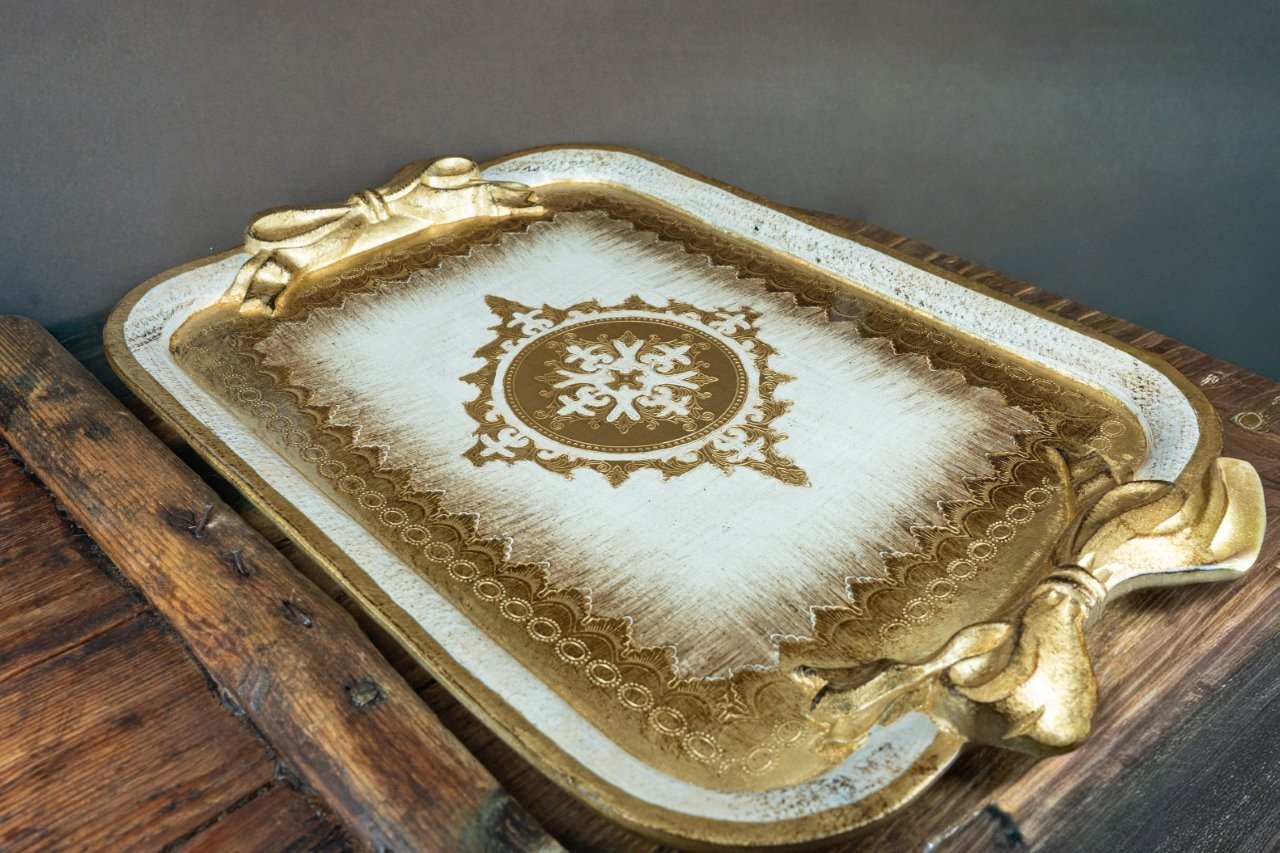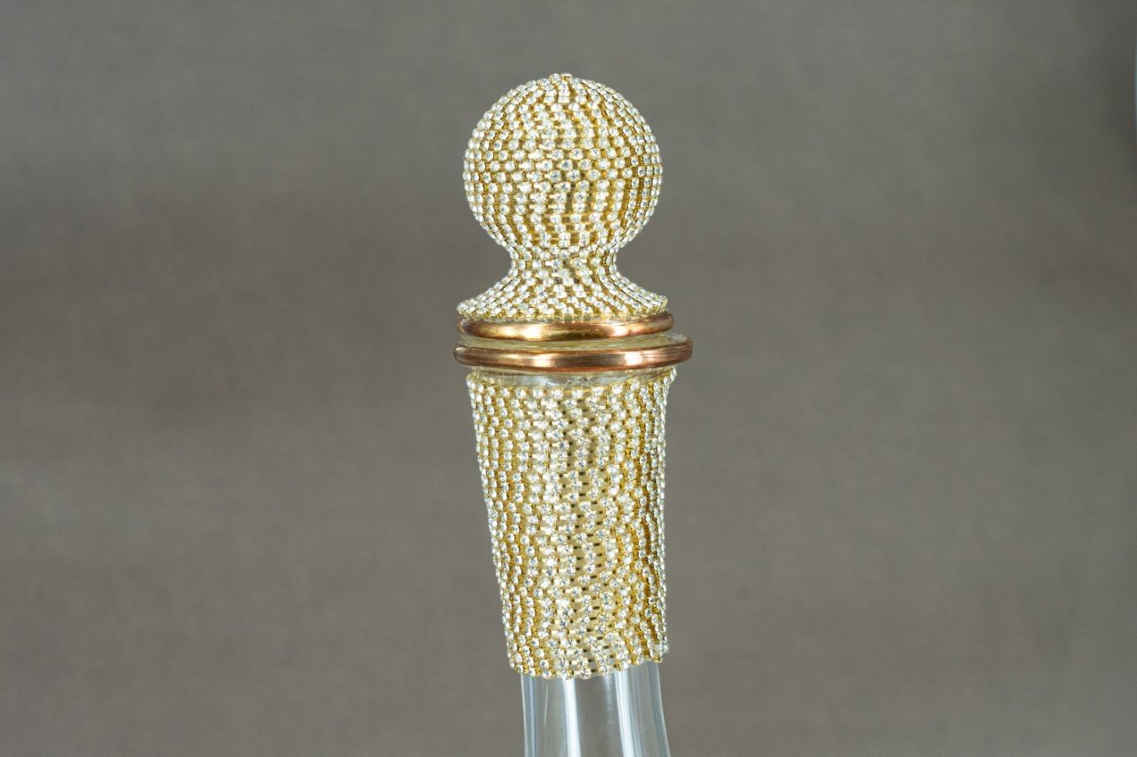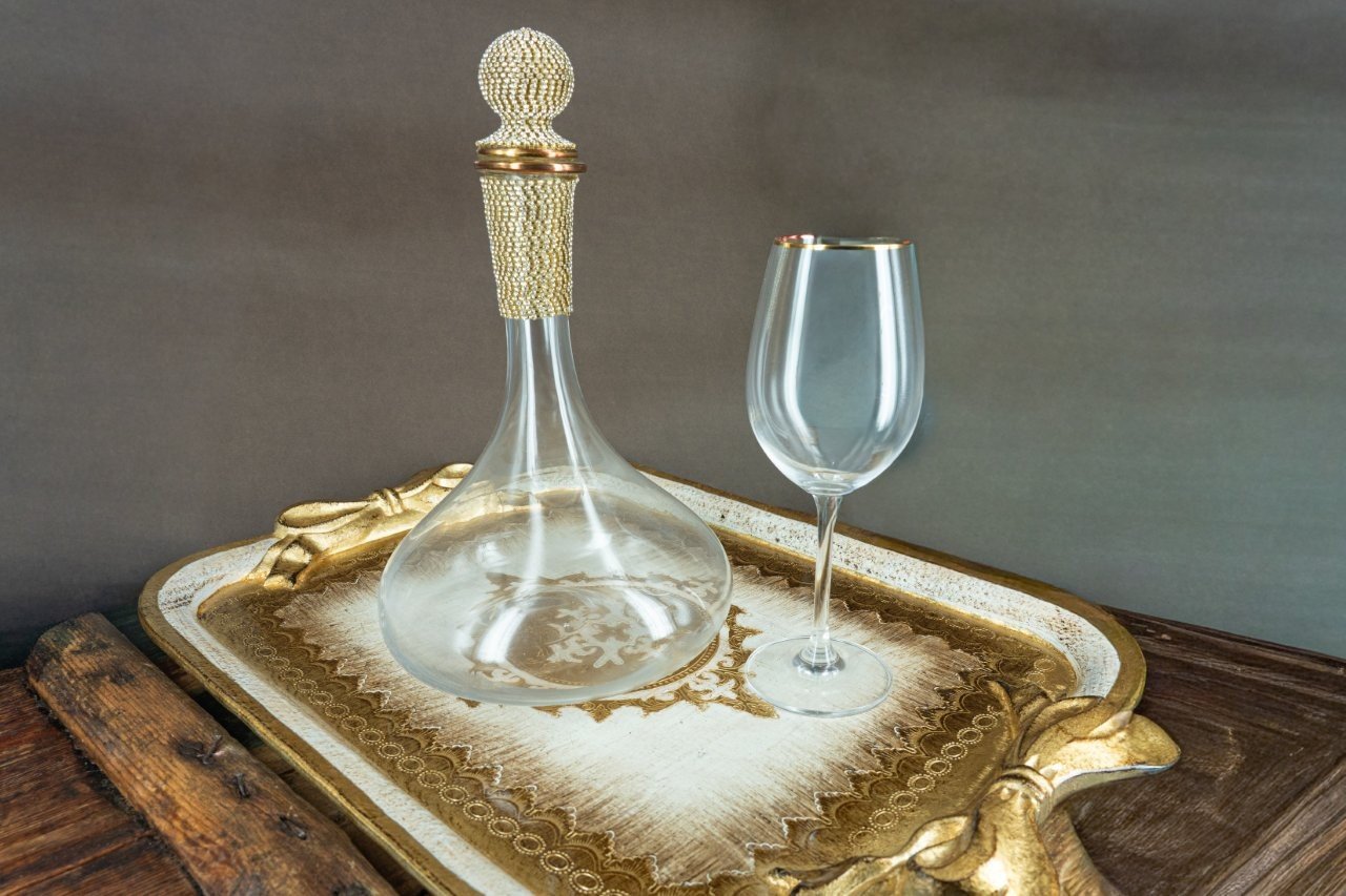 Σετ γάμου, με ξυλόγλυπτο Φλωρεντιανό δίσκο χρυσού χρώματος(77,00), κρυστάλλινη καράφα στολισμένη με αλυσίδα από πέτρες τύπου swarovski και ποτήρι με χρυσή ρίγα(63,00).