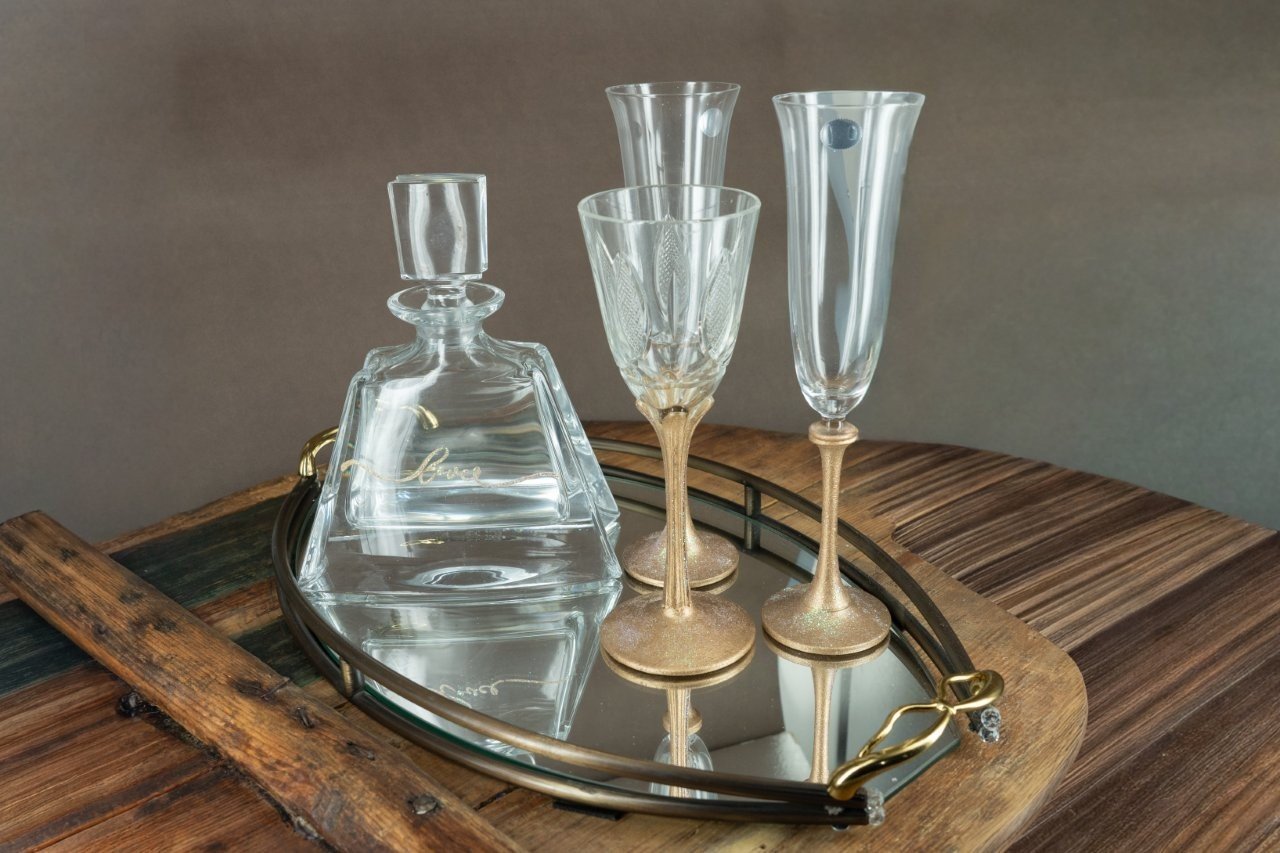 Σετ Γάμου Πολυτελείας με Καράφα & Ποτήρια σε Χρυσό Δίσκο
