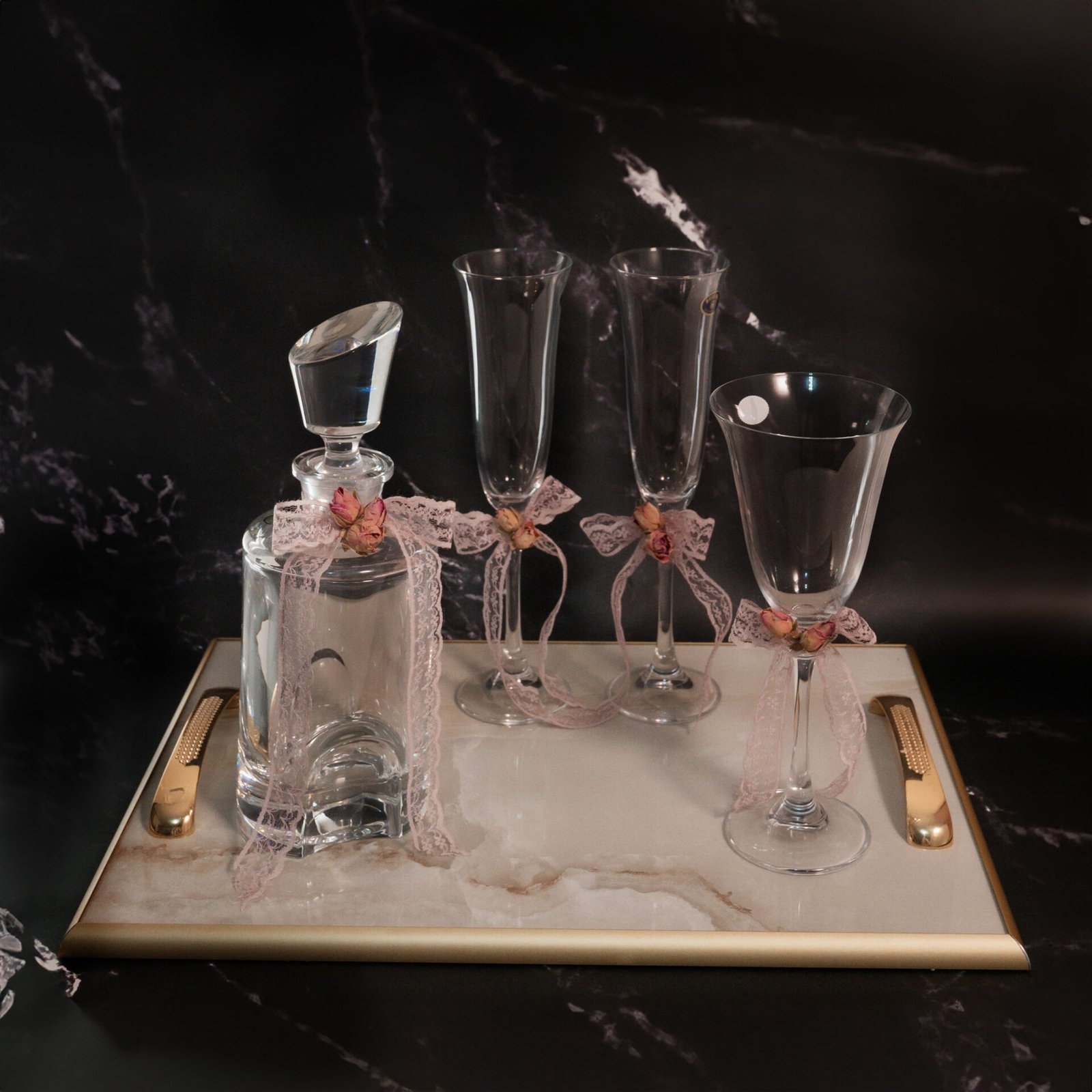 Ολοκληρωμένο σετ γάμου. Περιλαμβάνει χρυσό δίσκο τύπου μάρμαρο (106,00) κρυστάλλινη καράφα και ένα ποτήρι κρασιού διακοσμημένα με αποξηραμένα τριαντάφυλλα και λιλά κορδέλες(70,00) καθώς και δύο ποτήρια σαμπάνιας με τον ίδιο στολισμό(38,00).