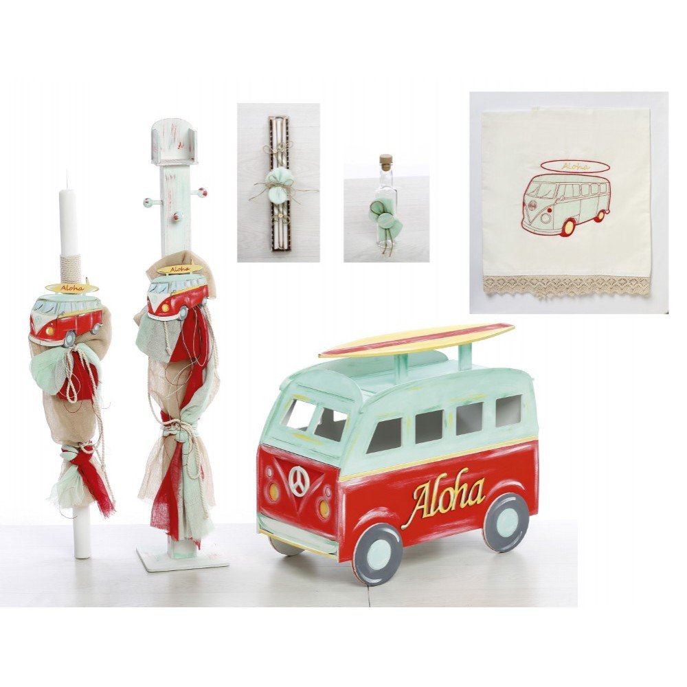 Ζήστε την απόλυτη καλοκαιρινή διάθεση με το μοναδικό πακέτο βάπτισης Aloha Van! Σε ζωηρά χρώματα κόκκινο, τιρκουάζ και μπεζ, με surf style λεπτομέρειες, χαρίζει ξεχωριστή ενέργεια και fun χαρακτήρα στη βάπτιση.