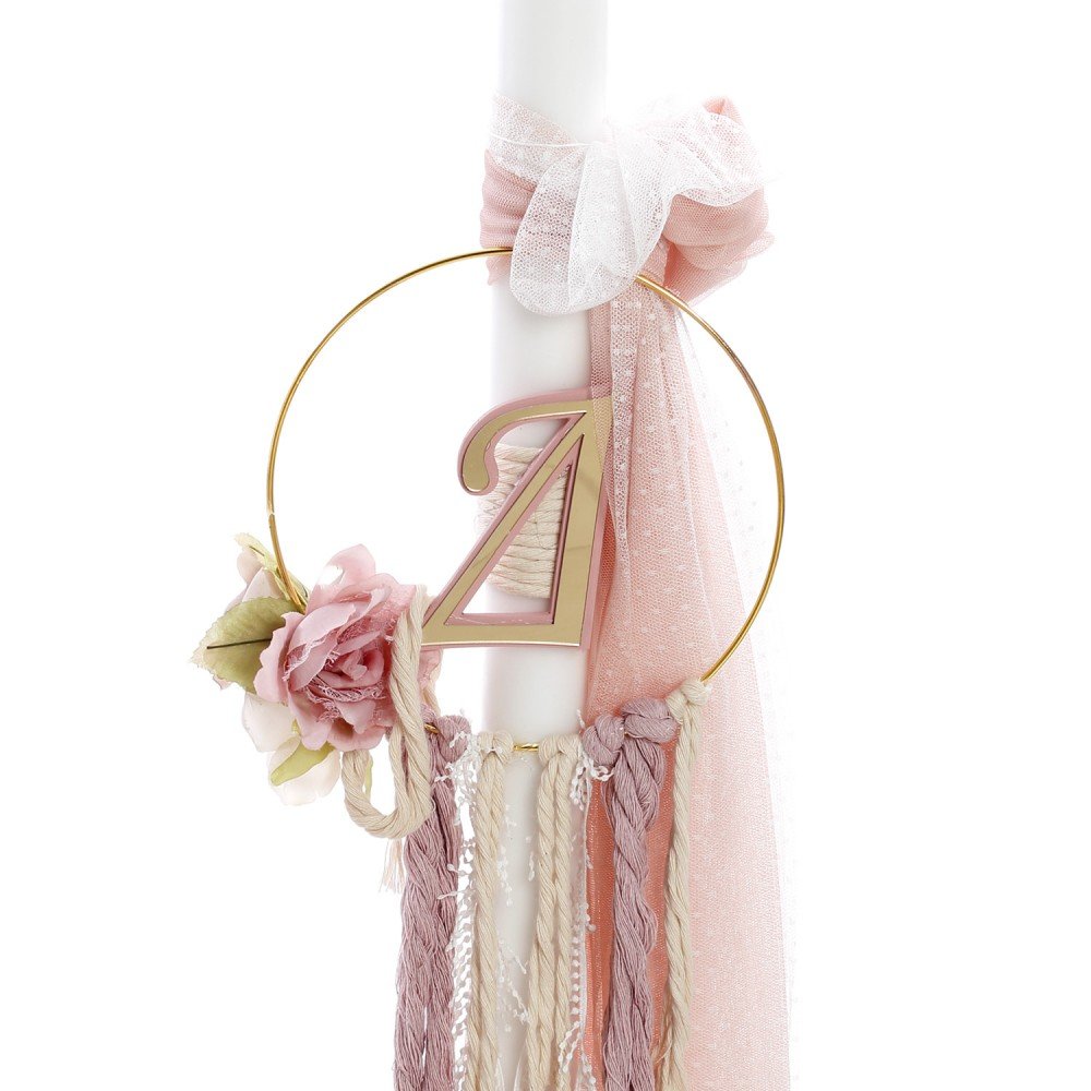 Λαμπάδα βάπτισης με το μονόγραμμα και στολισμό από κορδέλες και λουλούδια.