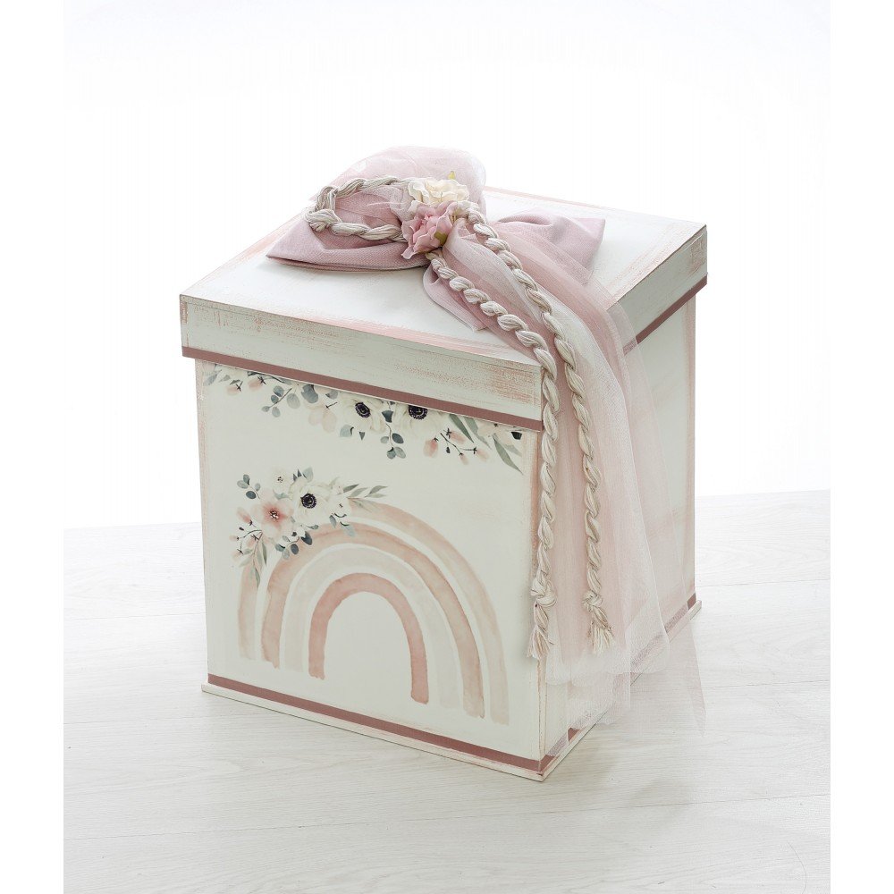 Ξύλινο κουτί βάπτισης στολισμένο με ουράνιο τόξο και χειροποίητες λεπτομέρειες.