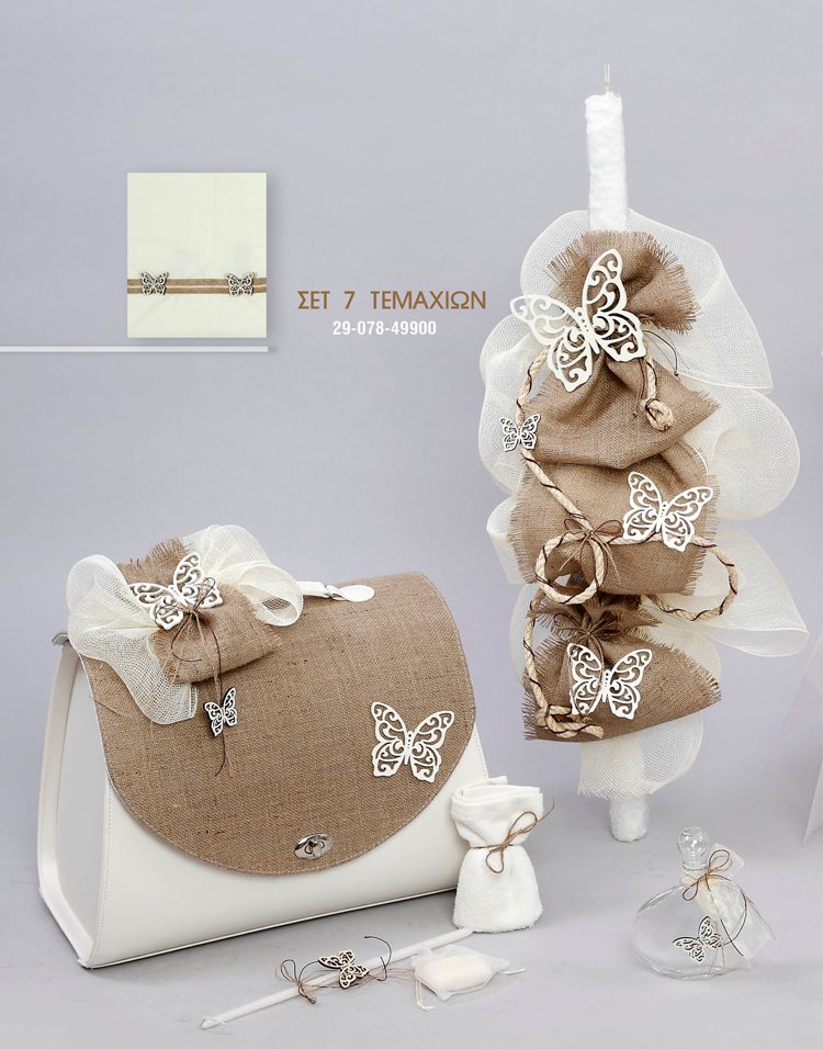 Χαρίστε κομψότητα και φυσικό στυλ στη βάπτιση της μικρής σας με το μοναδικό πακέτο βάπτισης Πεταλούδα Σκαλιστή. Σε γήινες αποχρώσεις με λινάτσα και λευκές σκαλιστές πεταλούδες, αποτελεί ιδανική επιλογή για μια chic και ρομαντική βάπτιση.