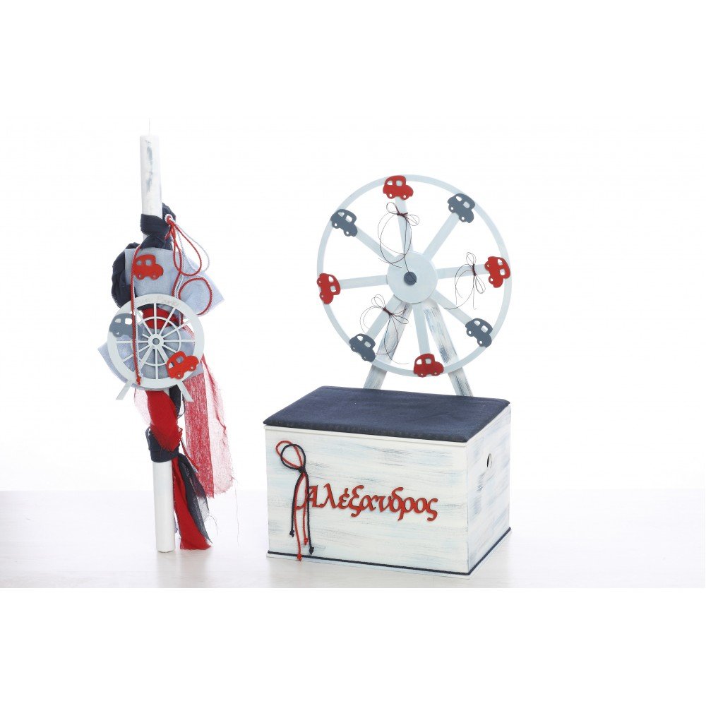 Φέρτε τη χαρά του λούνα παρκ στη βάπτιση με το εντυπωσιακό πακέτο βάπτισης Ρόδα Λούνα Παρκ! Σε αποχρώσεις μπλε, κόκκινο και γκρι, με διακοσμητική ρόδα και χαρούμενες λεπτομέρειες, αποτελεί μια ξεχωριστή επιλογή για αγοράκι.