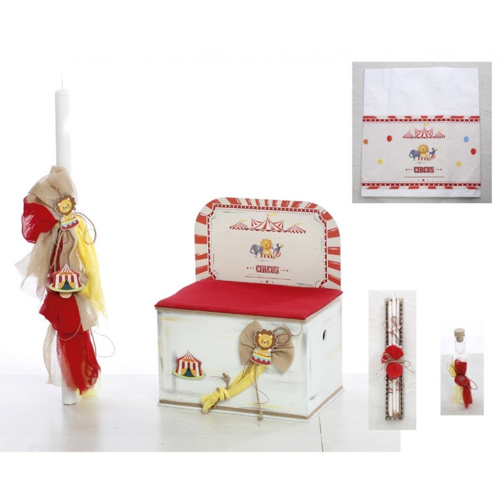 Φέρτε τη μαγεία του τσίρκου στη βάπτιση με το εντυπωσιακό πακέτο βάπτισης Τσίρκο. Με ζωηρά χρώματα, διακοσμημένο με λιονταράκι και τέντα τσίρκου, χαρίζει ξεχωριστή χαρά και παιχνιδιάρικη διάθεση στο μυστήριο.