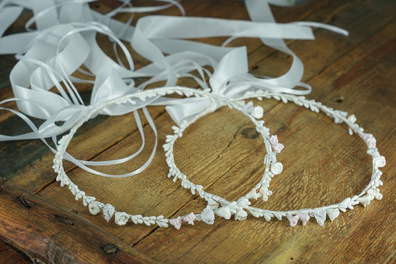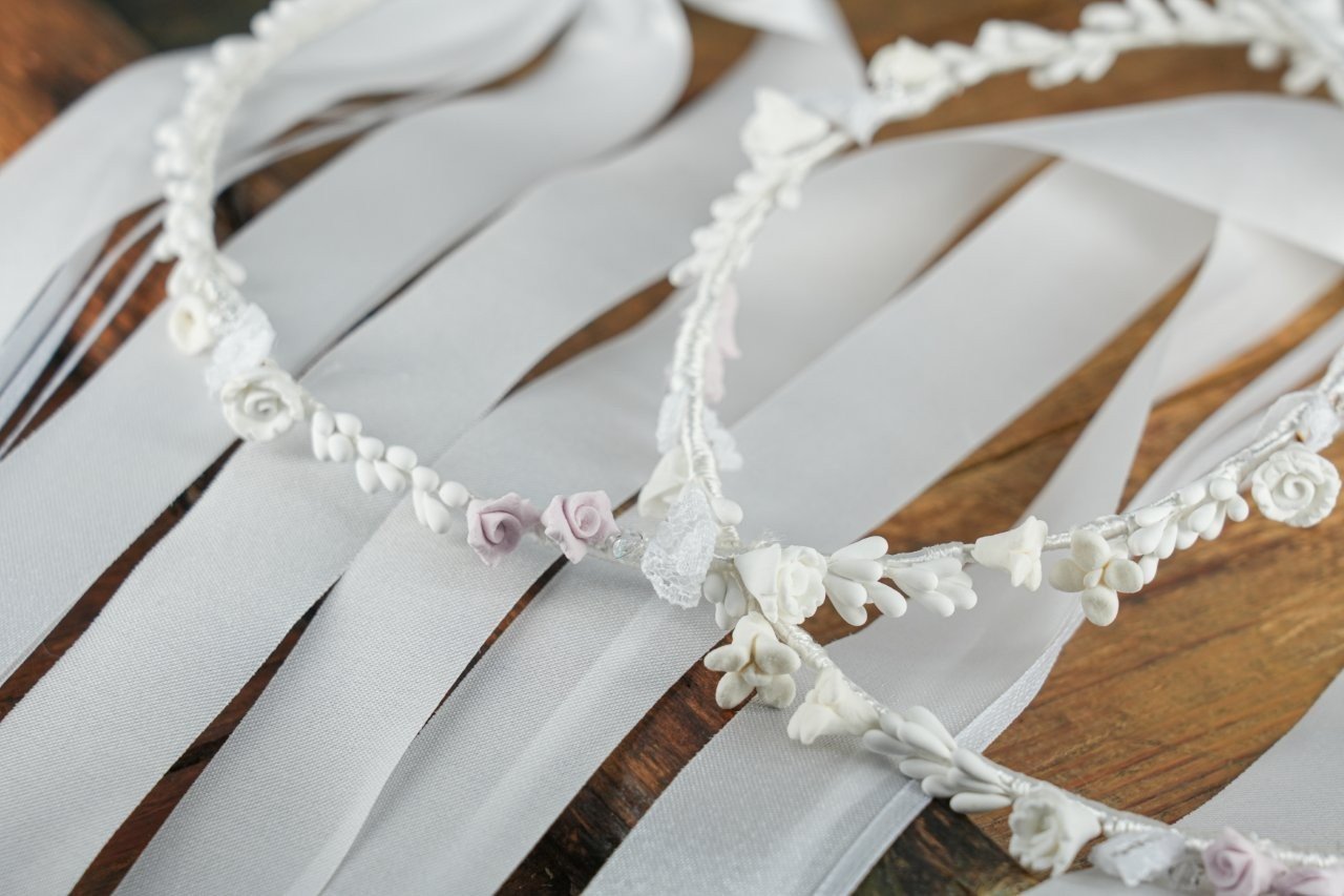 Χειροποίητα στέφανα διακοσμημένα με ροζ και λευκά πορσελάνινα λουλουδάκια δεμένα με σατέν, λευκές κορδέλες.