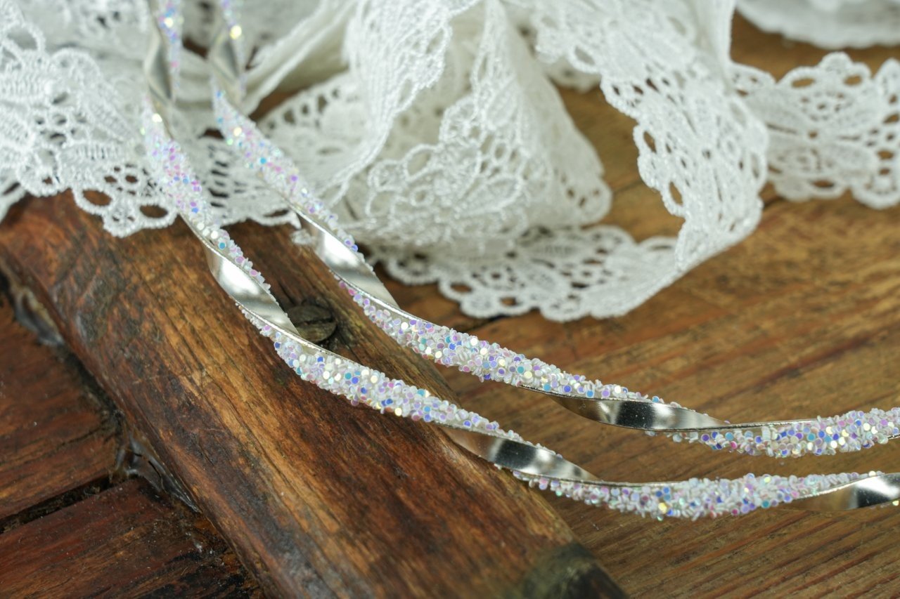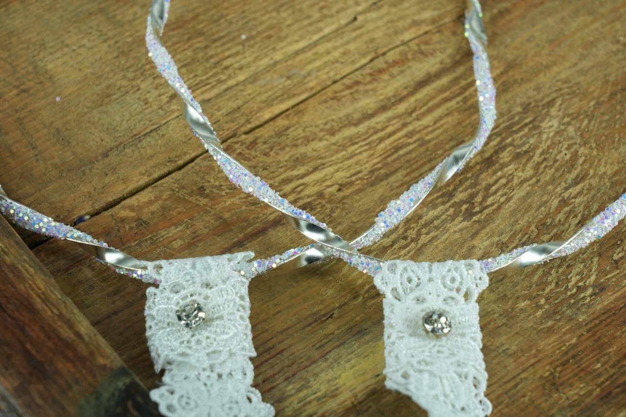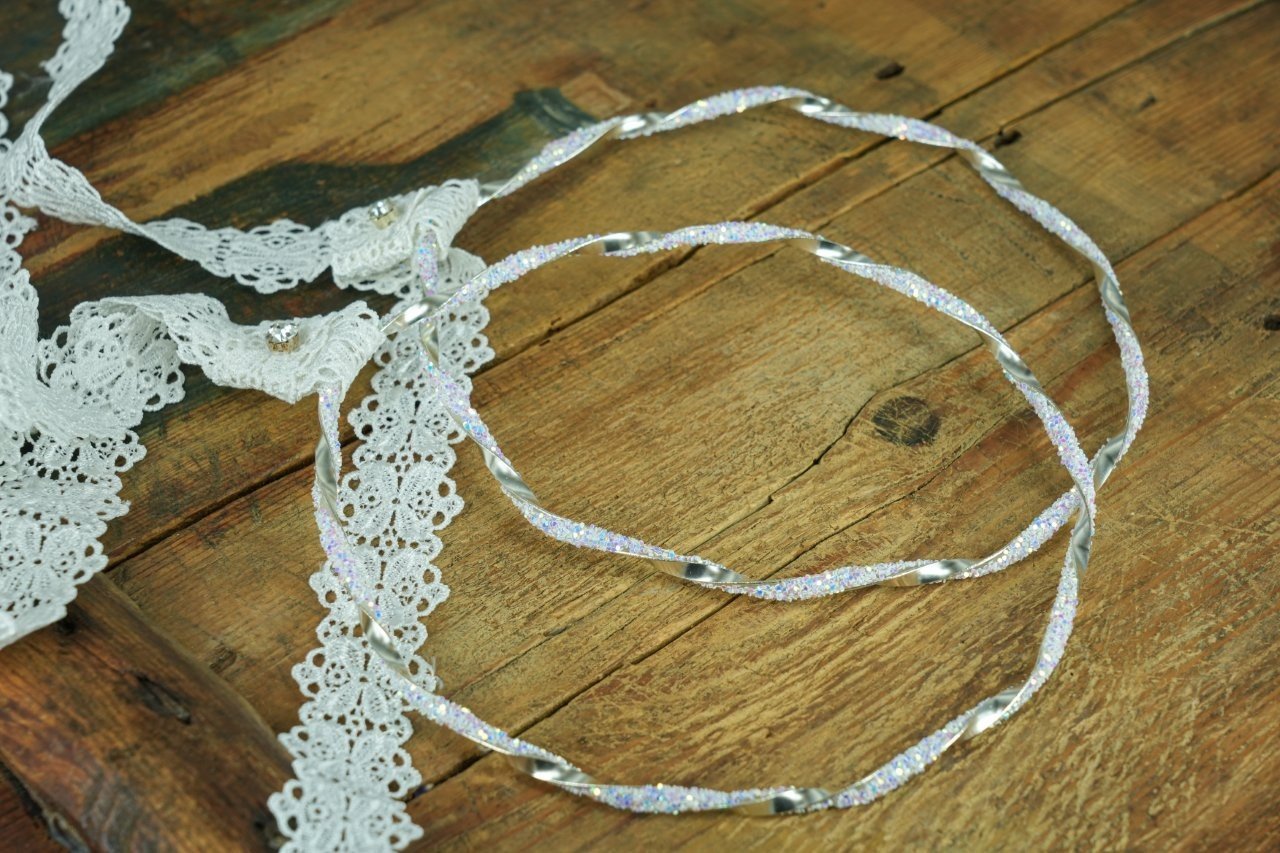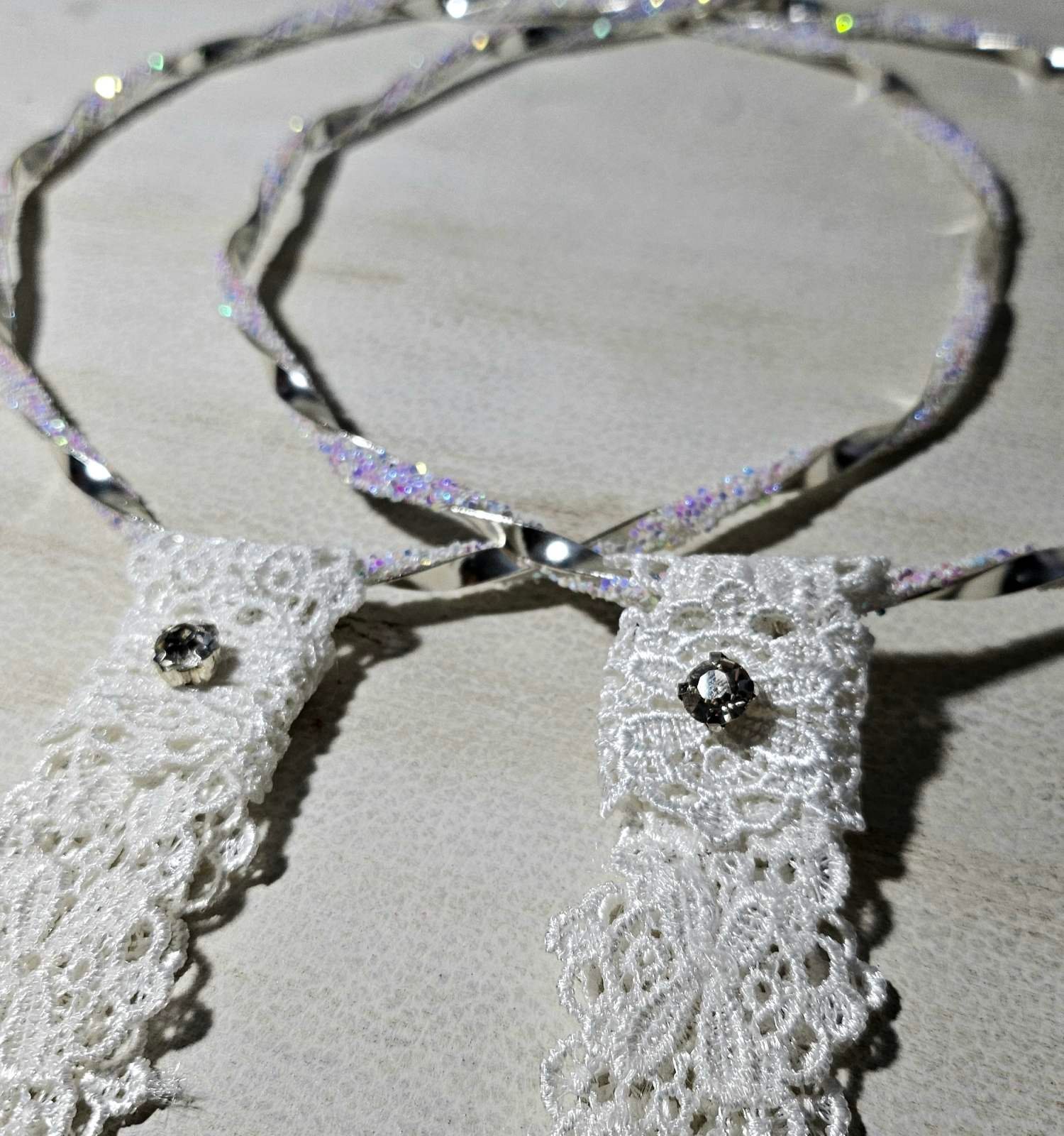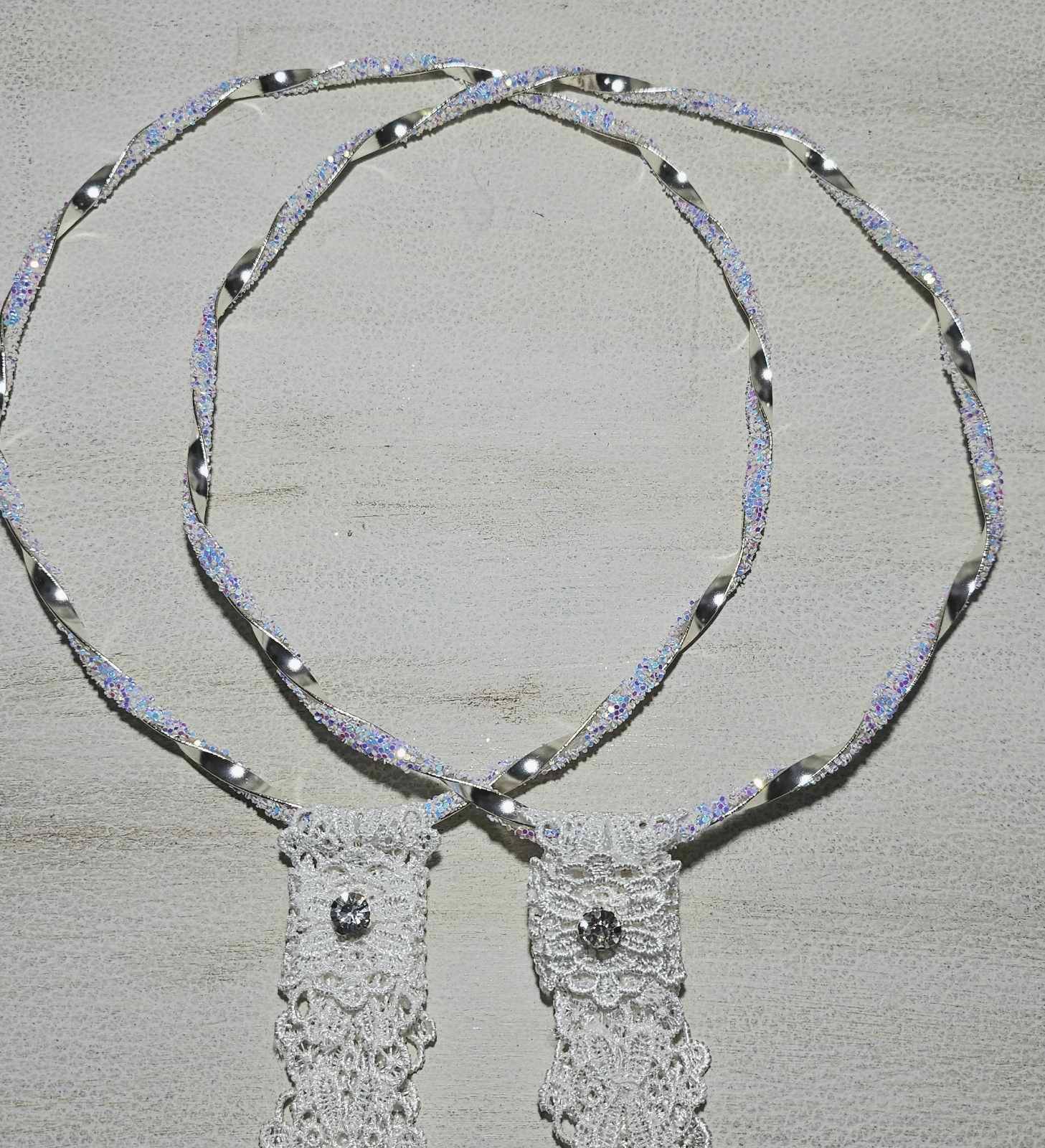 Επάργυρα στέφανα γάμου πλεγμένα με ιριδίζοντα κρυσταλλάκια, δεμένα με βαμβακερή δαντέλα και στρας τύπου Swarovski.