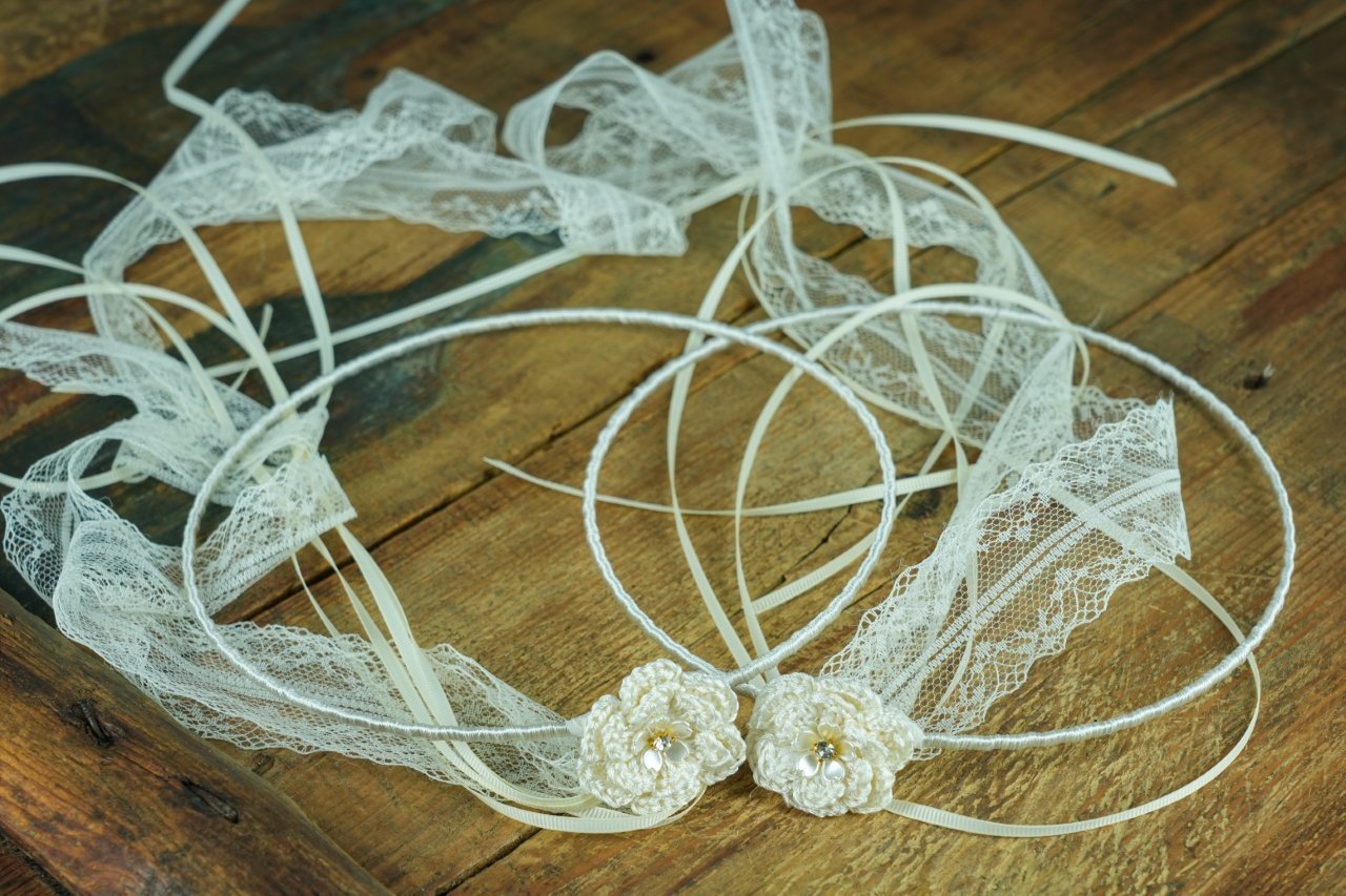 Στέφανα Γάμου Ιβουάρ με Πλεκτό Λουλούδι και Δαντέλα