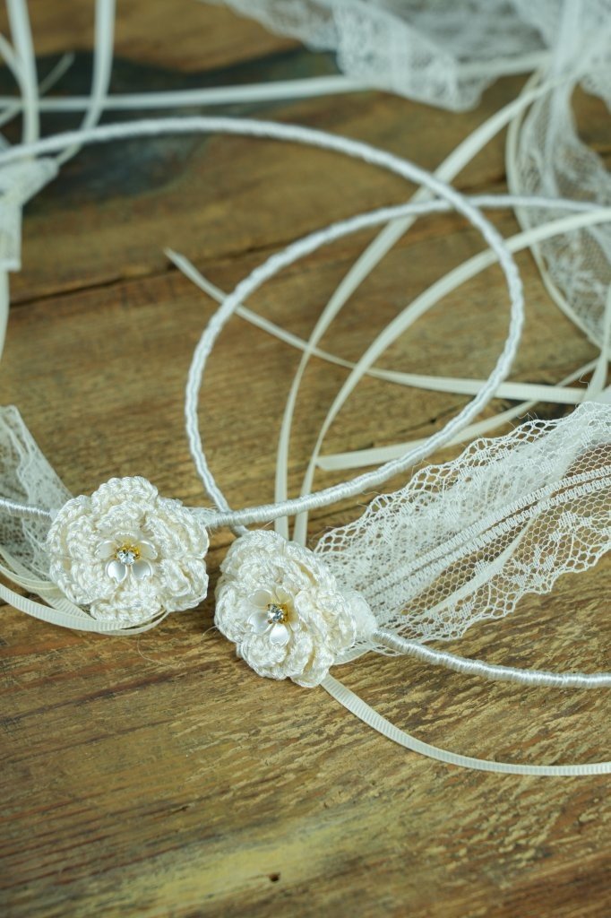 Χειροποίητα στέφανα πλεγμένα με μεταξωτή κλωστή, δεμένα με ιβουάρ δαντέλες και σατέν κορδέλες, στολισμένα με χειροποίητα, πλεκτά, μεταξωτά λουλούδια και διακοσμητικά, μικρά λουλουδάκια με στρας.