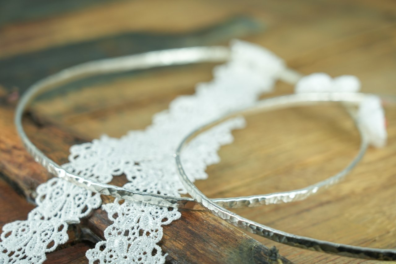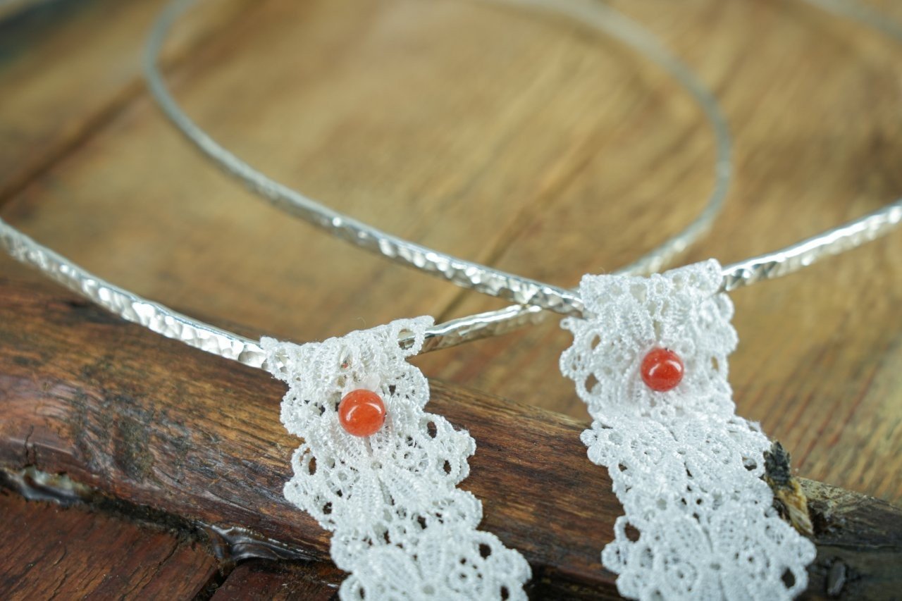 Επάργυρα σφυρήλατα στέφανα γάμου, δεμένα με βαμβακερή δαντέλα, διακοσμημένα στο πλάι με χειροποίητες πλεκτές καρδούλες στολισμένες με κόκκινα κοράλλια.