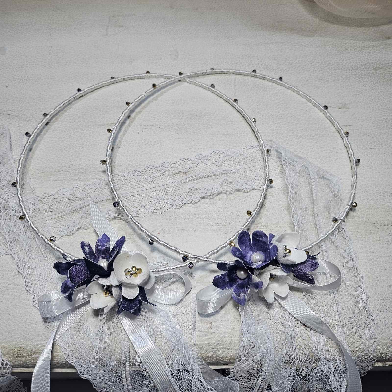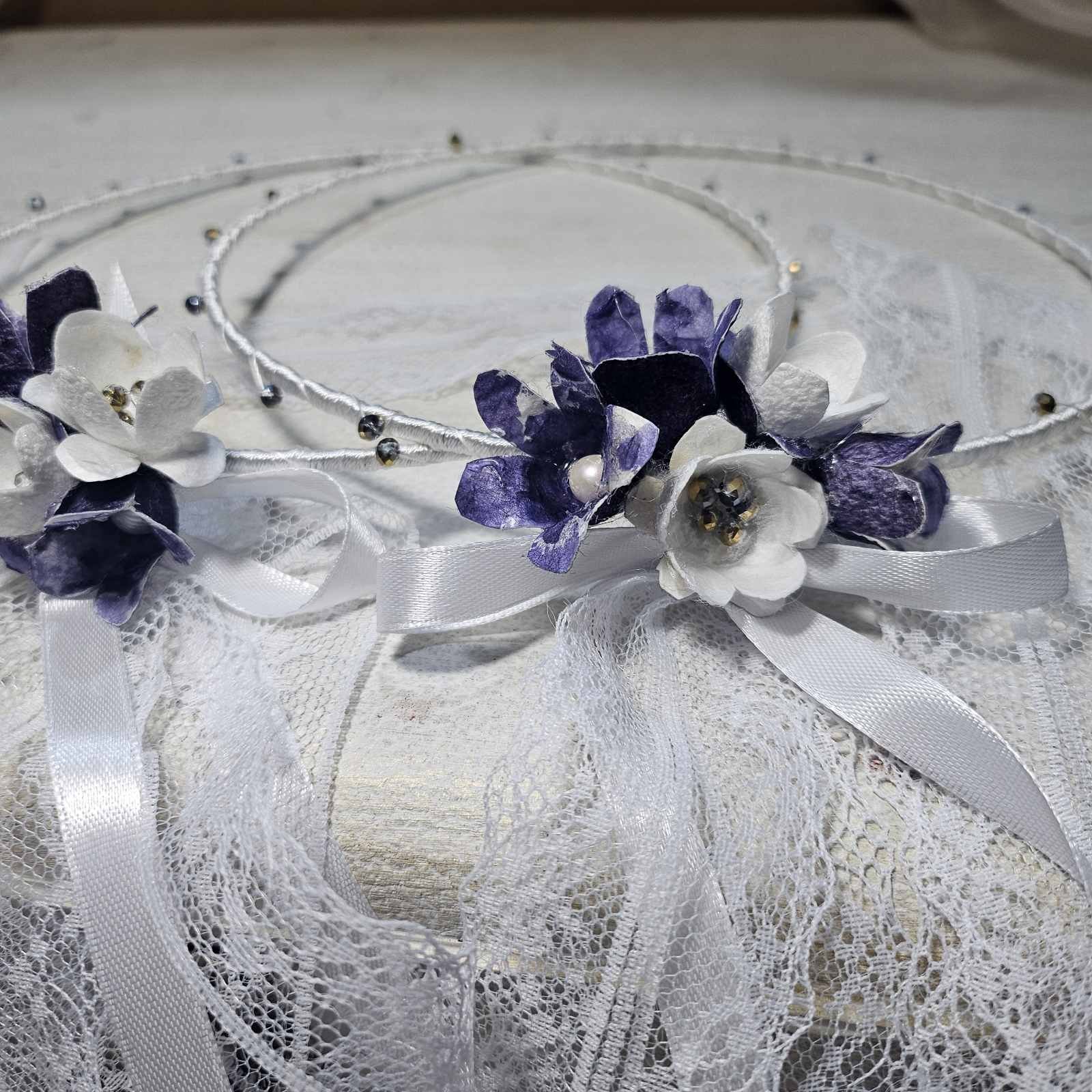 Χειροποίητα Στέφανα Γάμου με Μωβ και Λευκά Μεταξωτά Λουλούδια